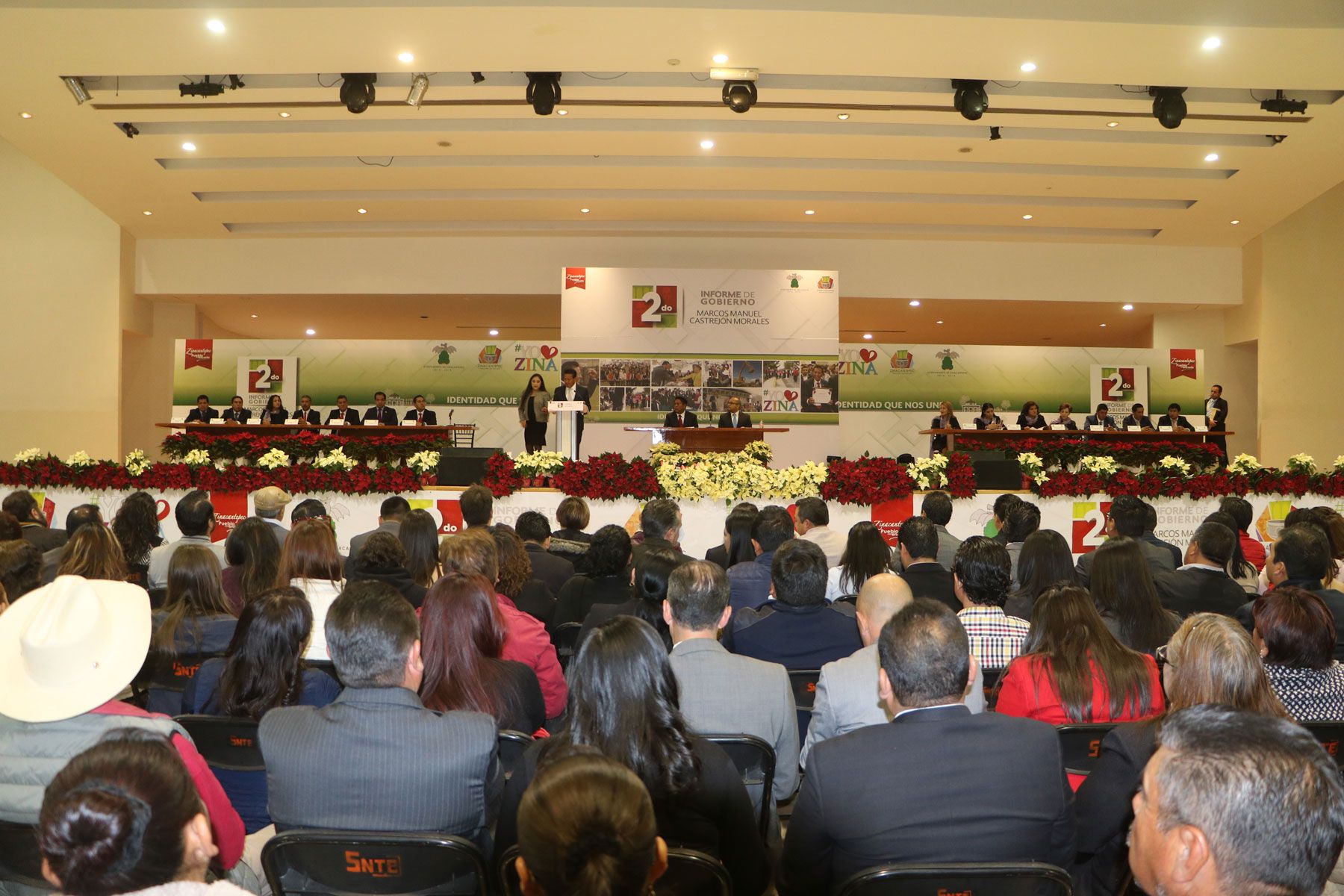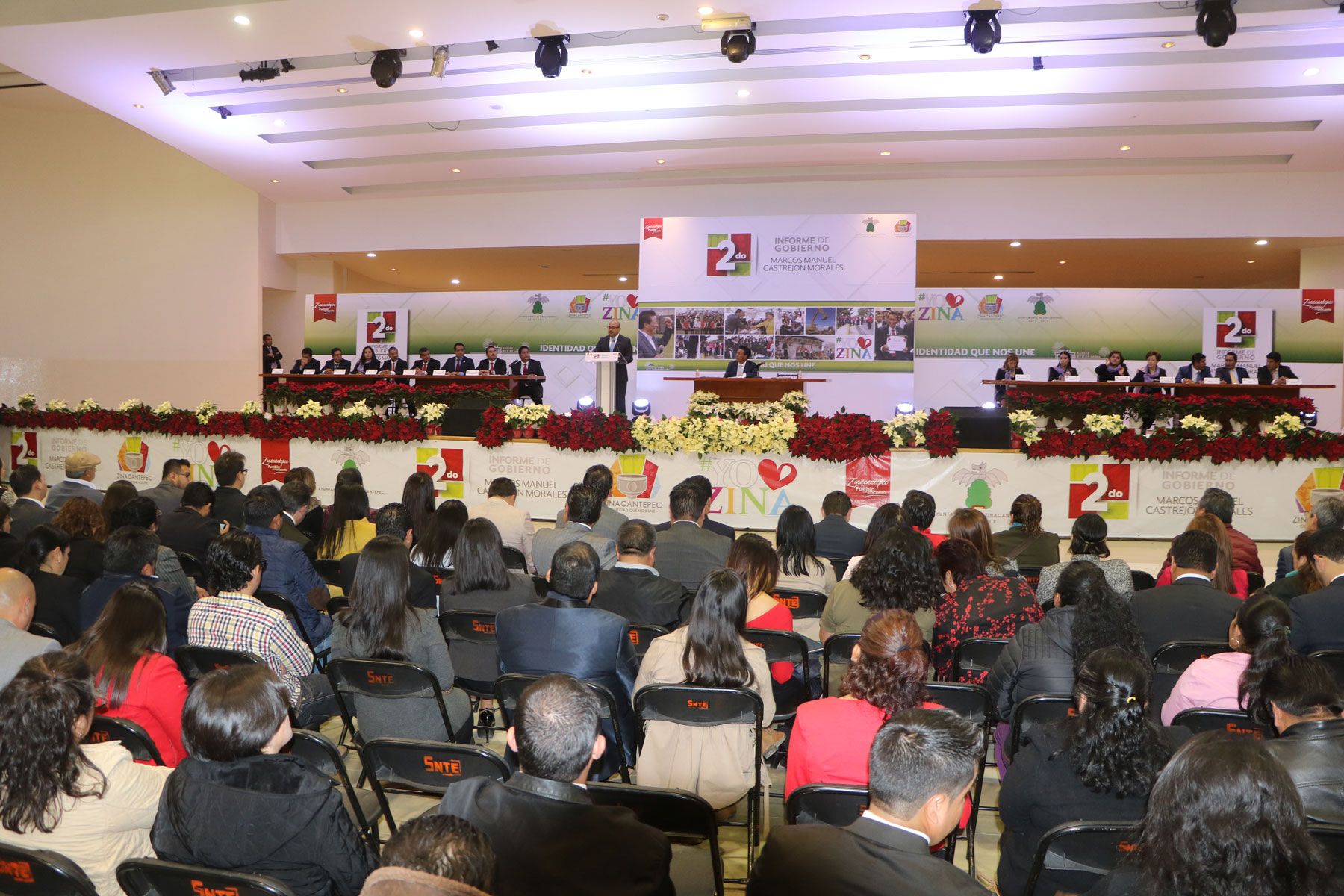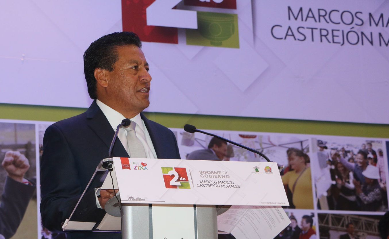 El presidente municipal de Zinacantepec, Manuel Castrejón Morales, ante Jafet Millán Márquez, representante del gobernador del Estado de México, Alfredo del Mazo Maza y el cabildo en pleno, rindió su segundo informe de gobierno, en el que destacó que “Durante estos dos años de gobierno, gracias al apoyo y participación de todas y todos los Zinacantepequenses, hemos logrado la realización de obras y acciones en cada una de las 48 localidades que integran nuestro Municipio, convencidos de que cuando trabajamos unidos en un mismo objetivo, somos capaces de superar cualquier reto”.