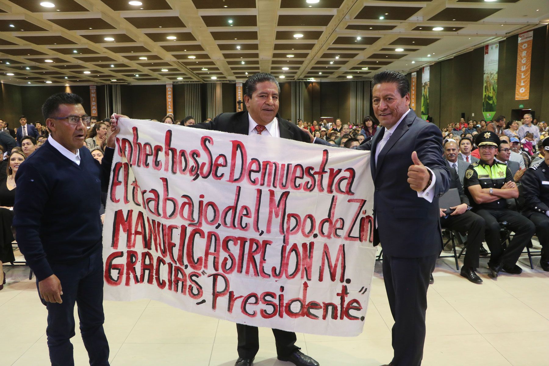 Destacó que es importante agradecer a dos grandes mexiquenses, que durante estos dos años de gestión, han apoyado al Gobierno Municipal y a los Zinacantepequenses con la ejecución de obras y acciones que han mejorado la calidad de vida de niñas, niños, adolescentes, adultos, mujeres y personas con discapacidad, desde aquí nuestra gratitud al Lic. Enrique Peña Nieto, Presidente de los Estados Unidos Mexicanos y al Ex Gobernador del Estado de México, Dr. Eruviel Ávila Villegas.