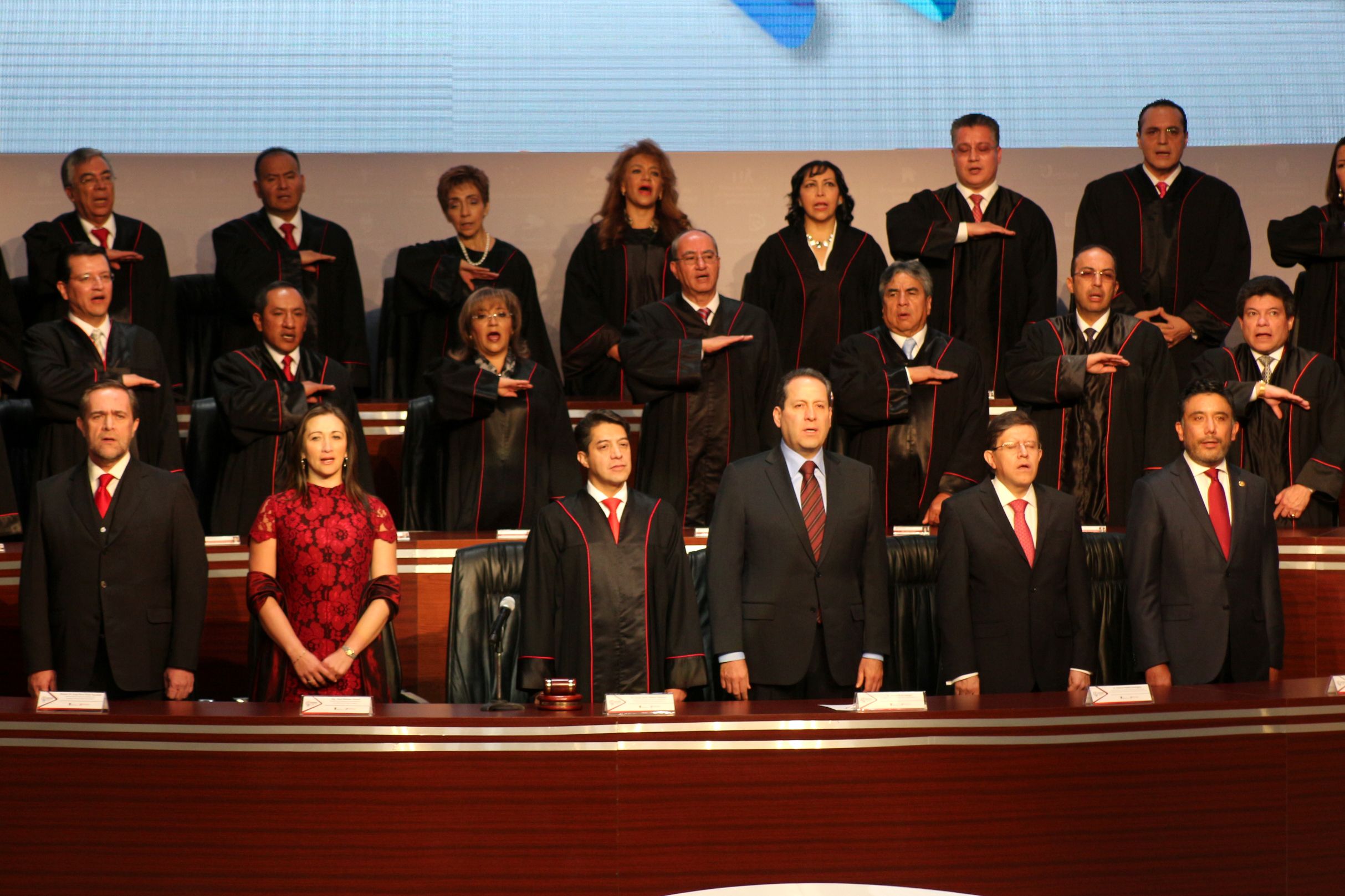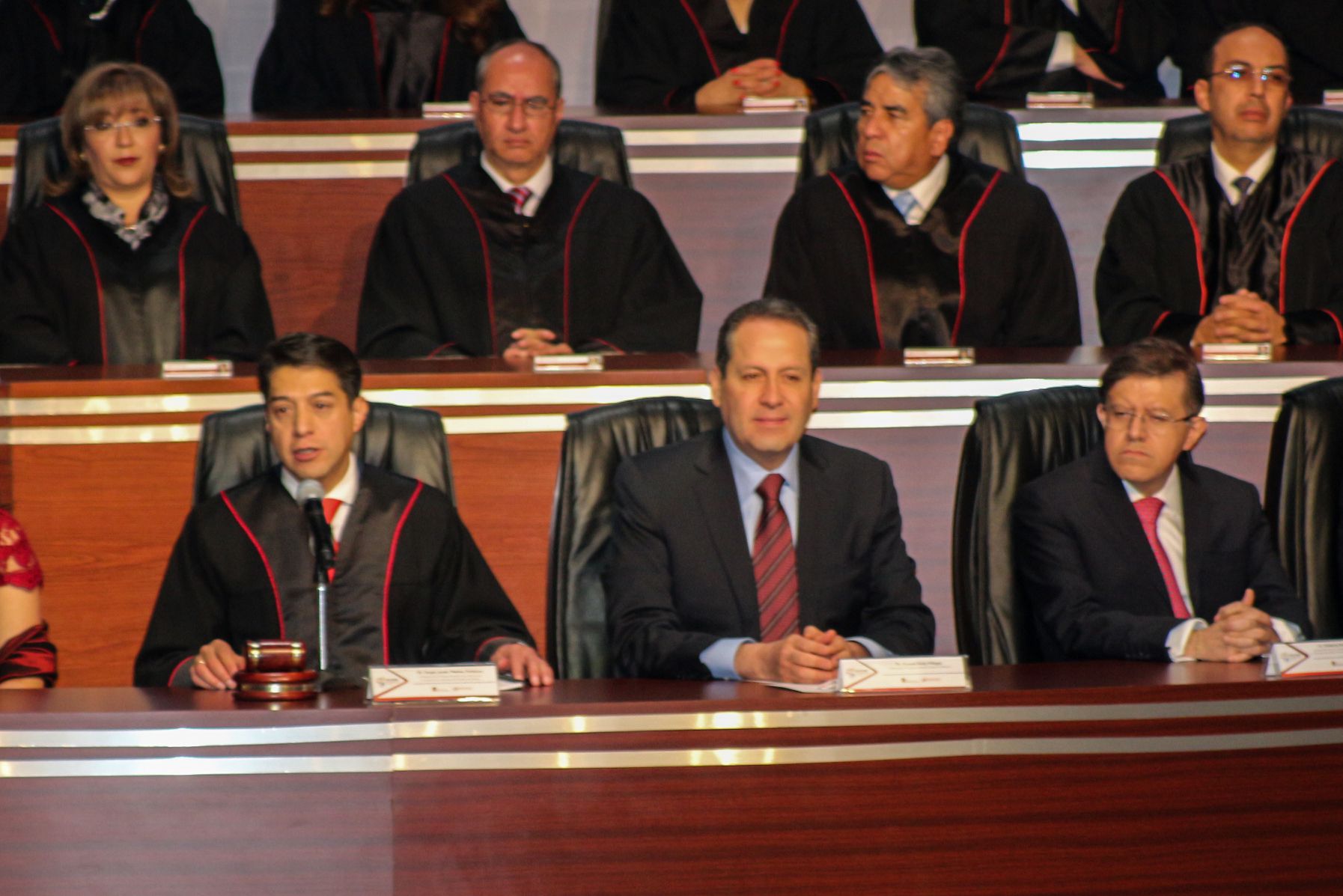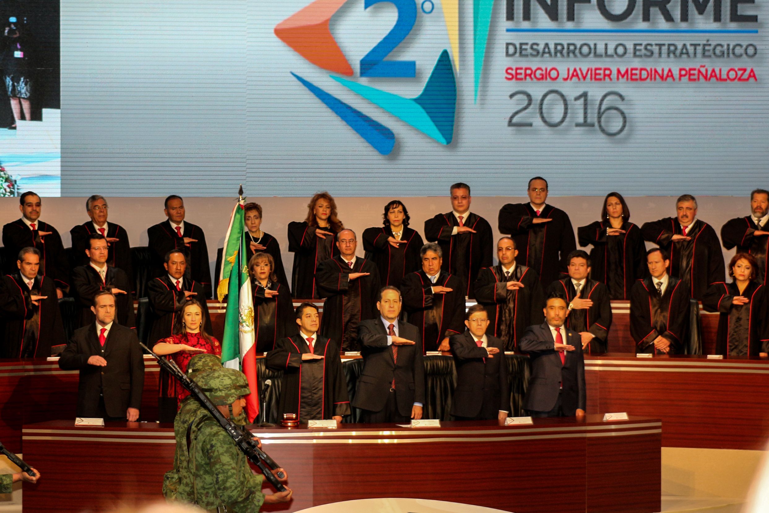 Sergio Medina Peñaloza, presidente del Tribunal Superior de Justicia del Estado de México, al rendir su Segundo Informe de Desarrollo Estratégico, destacó que, sin duda 2016 fue el año de la innovación, que consolida el proyecto humanista y de vanguardia de esta gestión, producto del trabajo cotidiano y del esfuerzo de todos los integrantes del Poder Judicial mexiquense.“Durante el periodo que se informa asumimos con madurez los desafíos que nos impuso la realidad y la dinámica de nuestra entidad y ejercimos con responsabilidad los recursos y las atribuciones legales, guiados por los seis ejes de nuestro Plan de Desarrollo para ofrecer una justicia confiable, capaz de responder a las expectativas de los mexiquenses”, agregó.