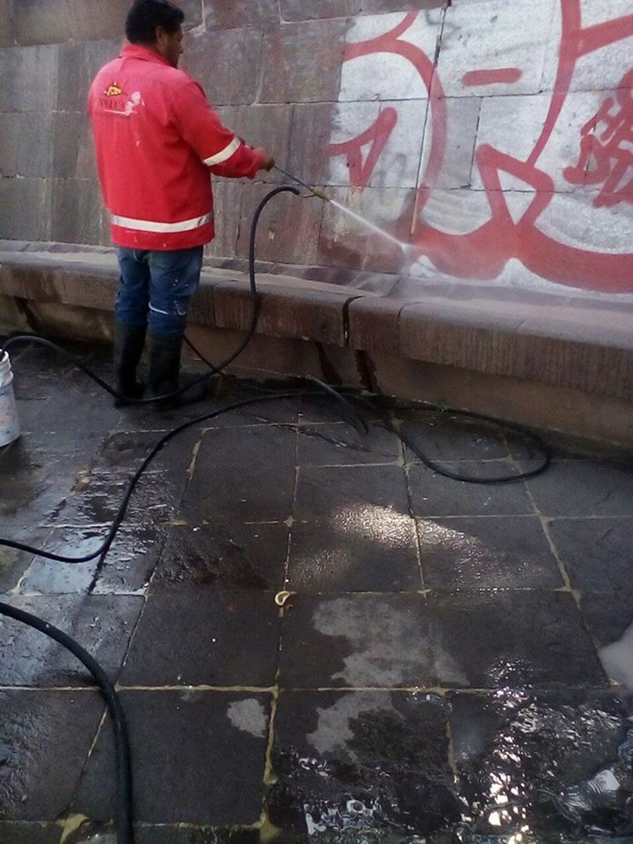 Cuadrillas de trabajadores del Departamento de Mantenimiento a Fuentes, Plazas y Monumentos llevaron a cabo el retiro de grafiti con arena sílica y limpieza con hidrolavadora en el monumento a los Niños Héroes, Hemiciclo a Juárez y al del General Ignacio López Rayón, punto donde también se aplicó pintura.