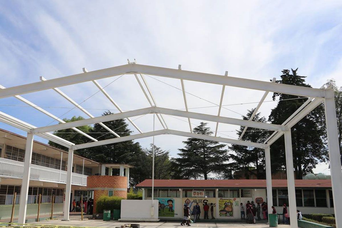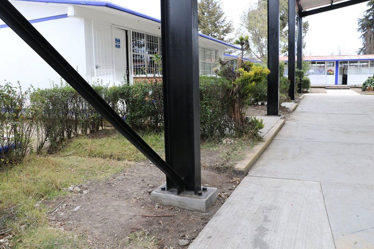 Los trabajos incluyen la colocación de zapatas aisladas de concreto, trabes, láminas y columnas de acero IPR, largueros transversales y horizontales, cubierta de acero, canalón para la carga pluvial e instalación de la tubería para descargar el agua, obras que cumplen con los lineamientos que dicta el Instituto Mexiquense de la Infraestructura Física Educativa.