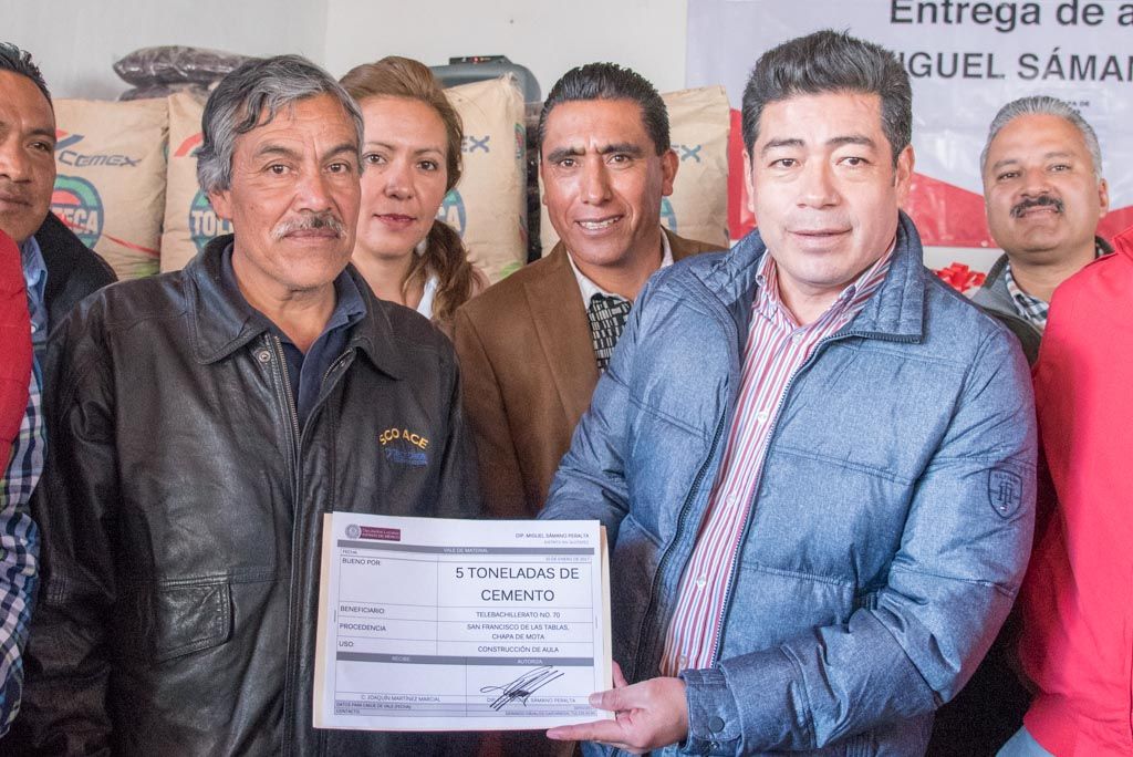 En beneficio de vecinos de Chapa de Mota, el diputado Miguel Sámano Peralta (PRI) entregó paquetes alimentarios e invernales, así como láminas de fibrocemento, además de juguetes a niños con motivo del Día de Reyes, además de recursos al Telebachillerato No. 70 de San Francisco de las Tablas, en gira de trabajo por este municipio.Acompañado del secretario de Cultura y presidente del Gabinete Regional VIII, Eduardo Gasca Pliego, el legislador dijo que el desarrollo social se privilegia en el presupuesto estatal de este año, en el que ocho de cada diez pesos se destinan a este rubro.