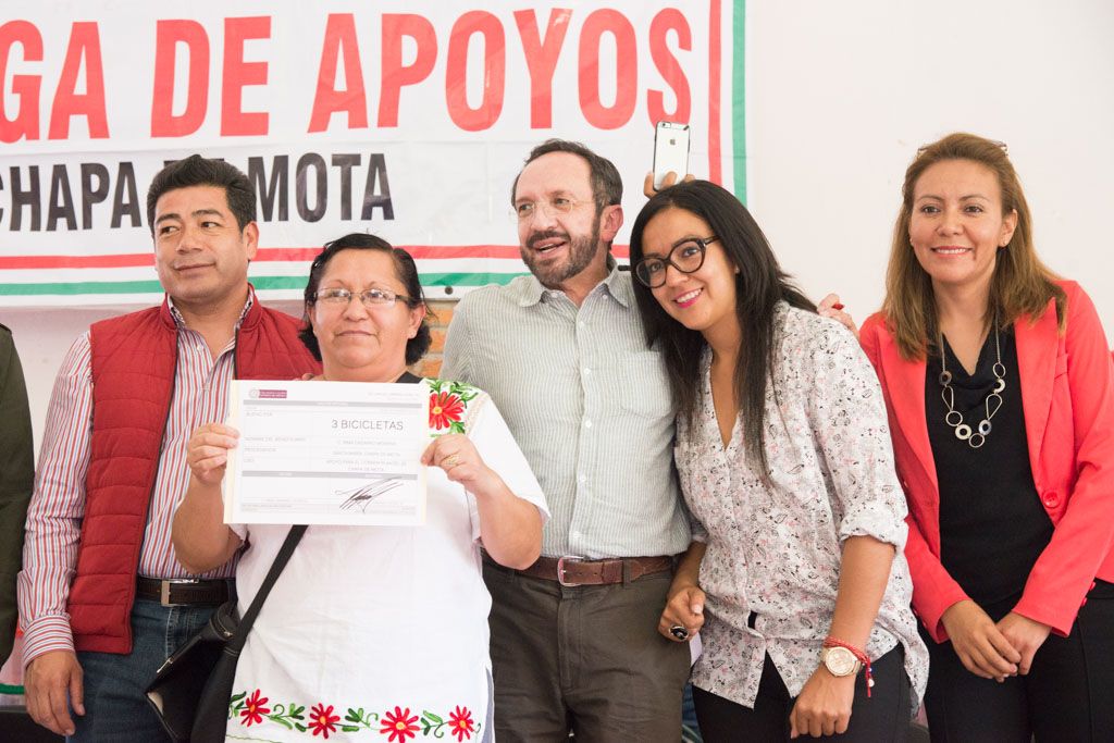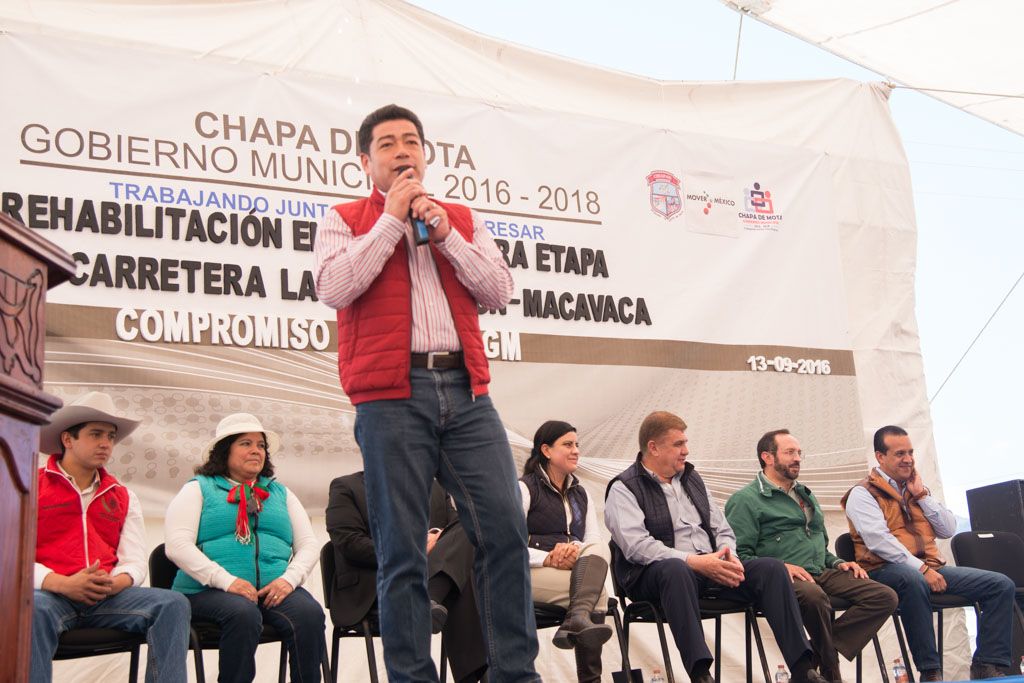El diputado Miguel Sámano Peralta (PRI) entregó recursos para 15 comunidades de Chapa de Mota, en gira de trabajo en la que participó en el inicio de los trabajos de rehabilitación de la carretera Macavaca-La Concepción que beneficiará a más de 8 mil personas de 19 comunidades de este municipio, en compañía de los secretarios general de Gobierno, José Manzur Quiroga, y de Cultura, Eduardo Gasca Pliego.En la comunidad de La Ladera, el legislador otorgó apoyos alimentarios, sillas de ruedas, andaderas, bastones y muletas, así como pintura para la rehabilitación de escuelas y apoyos económicos para centros sociales y de salud.