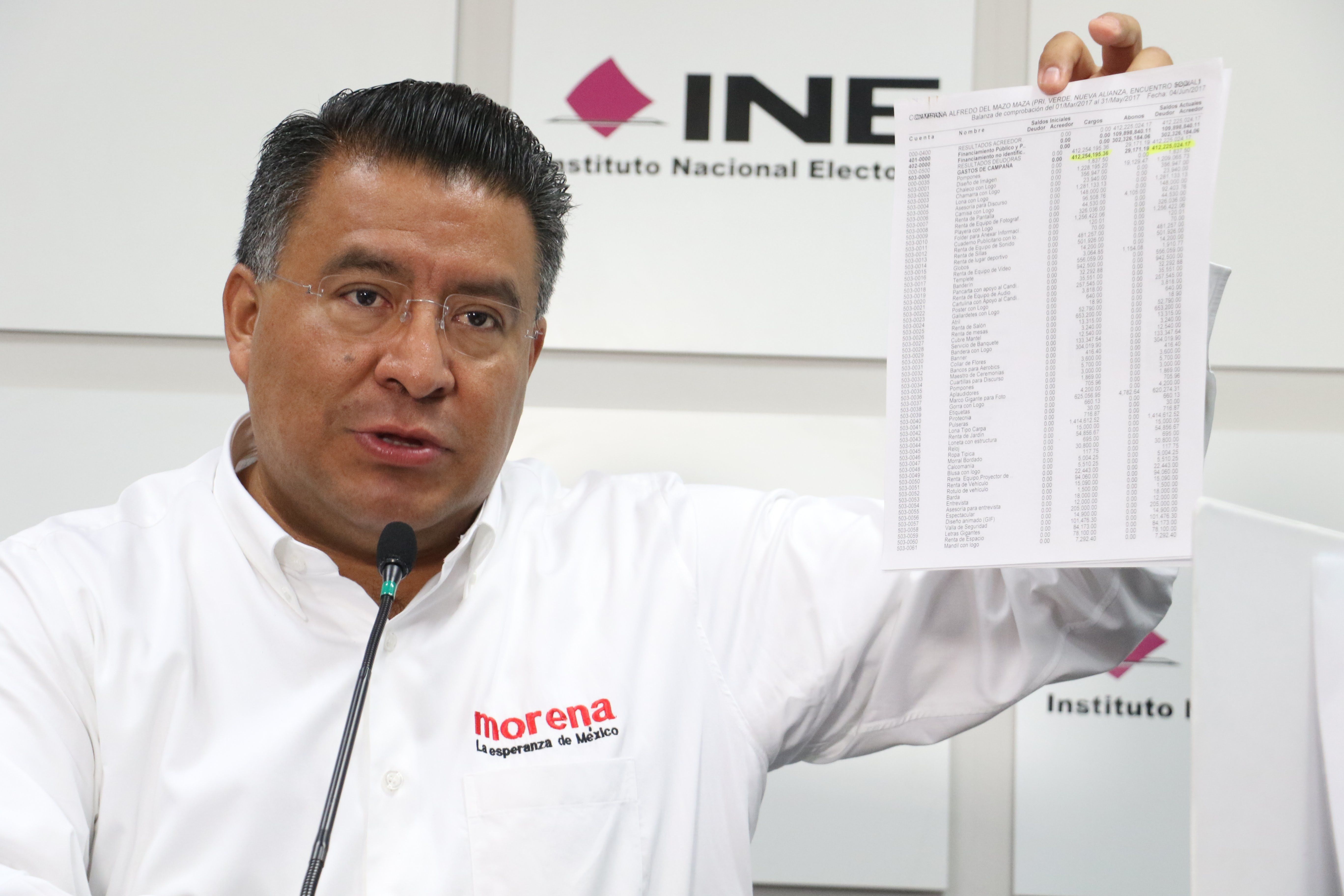 Morena denunció que Alfredo del Mazo, candidato a la gubernatura del Estado de México de la coalición PRI-Partido Verde-Nueva Alianza-Encuentro Social, gastó al menos 412.2 millones de pesos, por lo que rebasó en 126.6 millones de pesos los topes de gastos de campaña.Horacio Duarte Olivares, representante de Morena ante el Instituto Nacional Electoral (INE), dio a conocer nueve carpetas con documentos que demuestran que Del Mazo realizó una doble contabilidad en su campaña a la gubernatura y se extralimitó de manera ilegal en 44 por ciento.