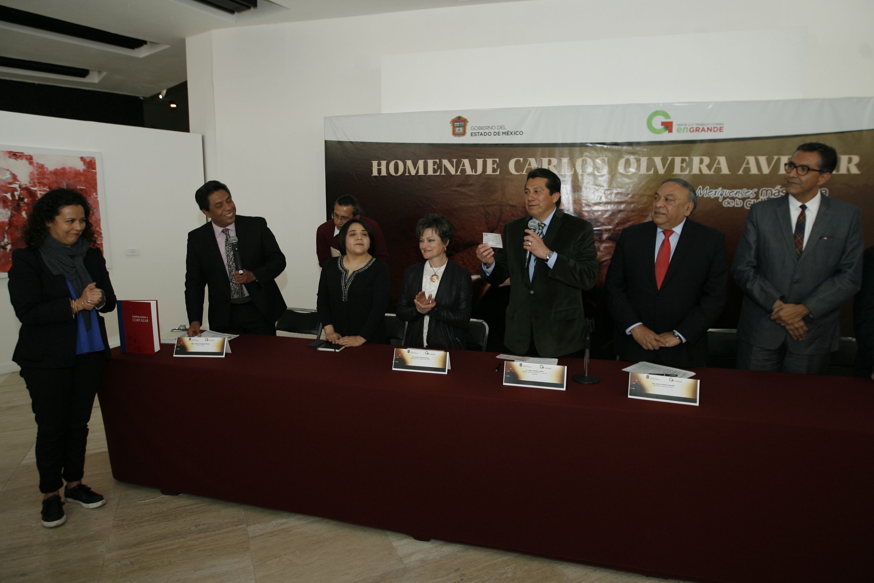 En este homenaje se dieron cita amigos y familiares del también escritor para recordarlo con gran cariño, entre los que destacan su viuda Patricia Mawaad, Porfirio Hernández, Celeste Ramírez y Roberto Fernández Iglesias, así como Felipe González, director general de Patrimonio y Servicios Culturales, e Ismael Ordóñez, secretario técnico del Consejo Editorial de la Administración Pública Estatal, que hablaron sobre la vida y obra de Carlos Olvera.