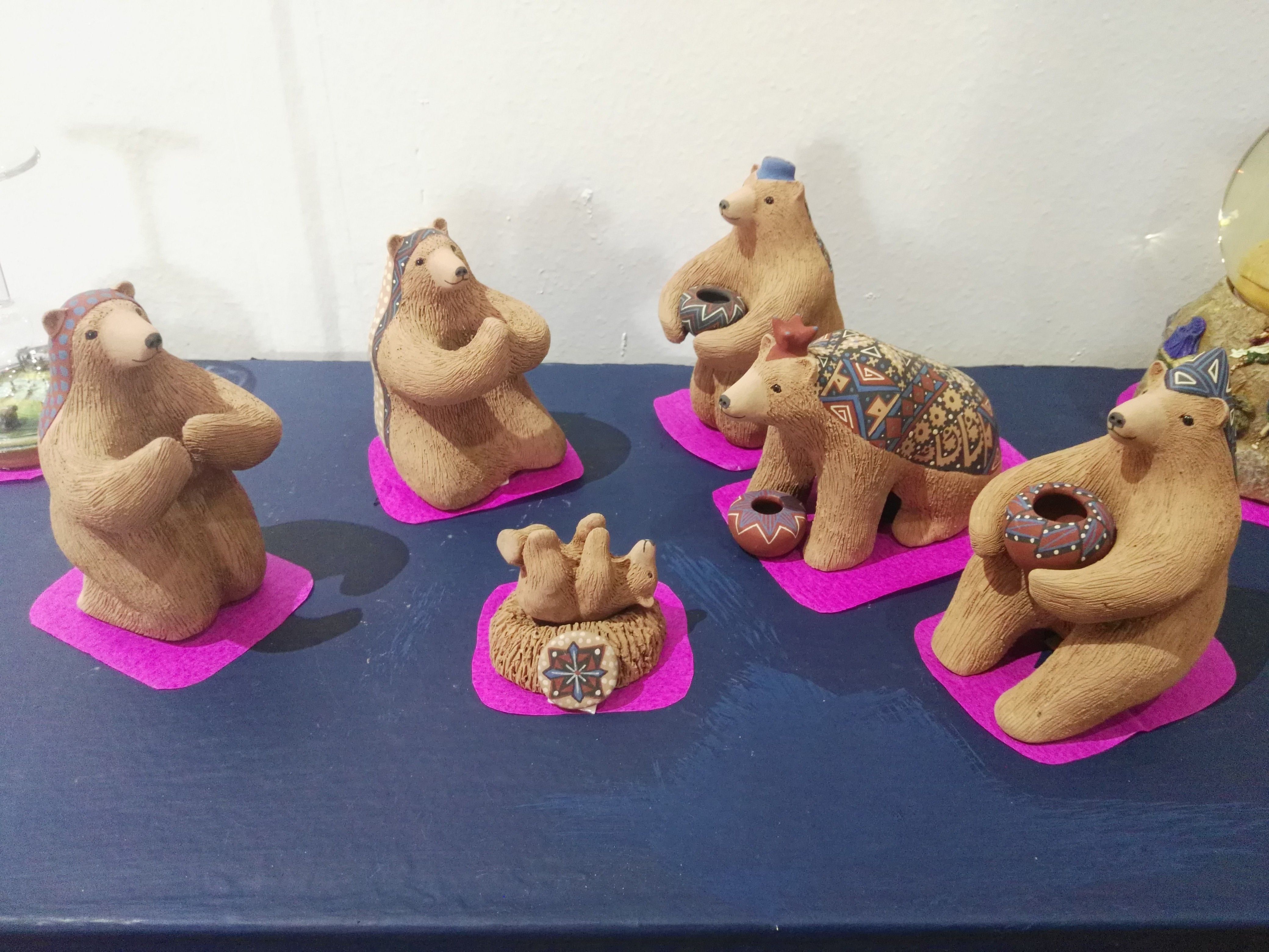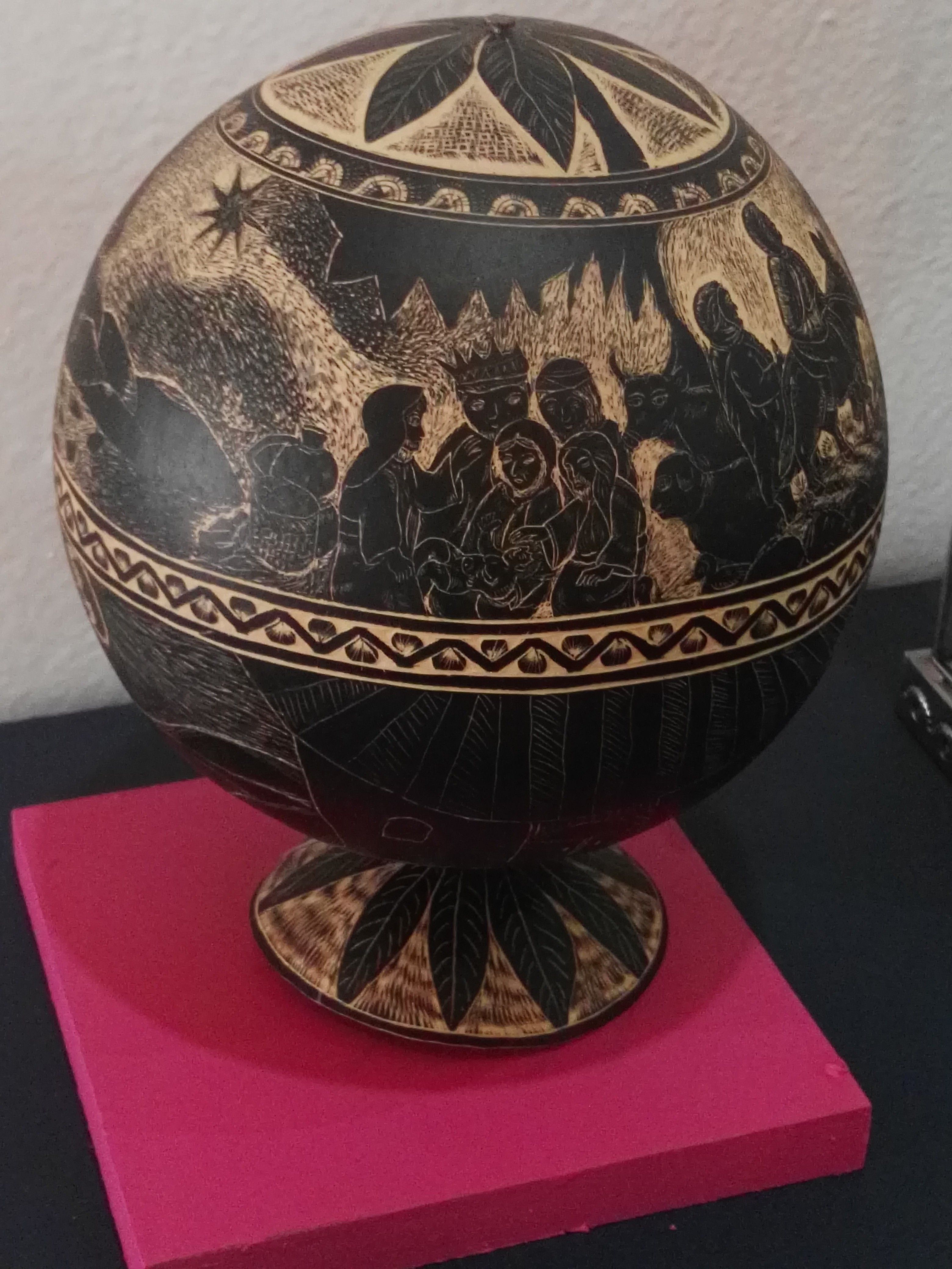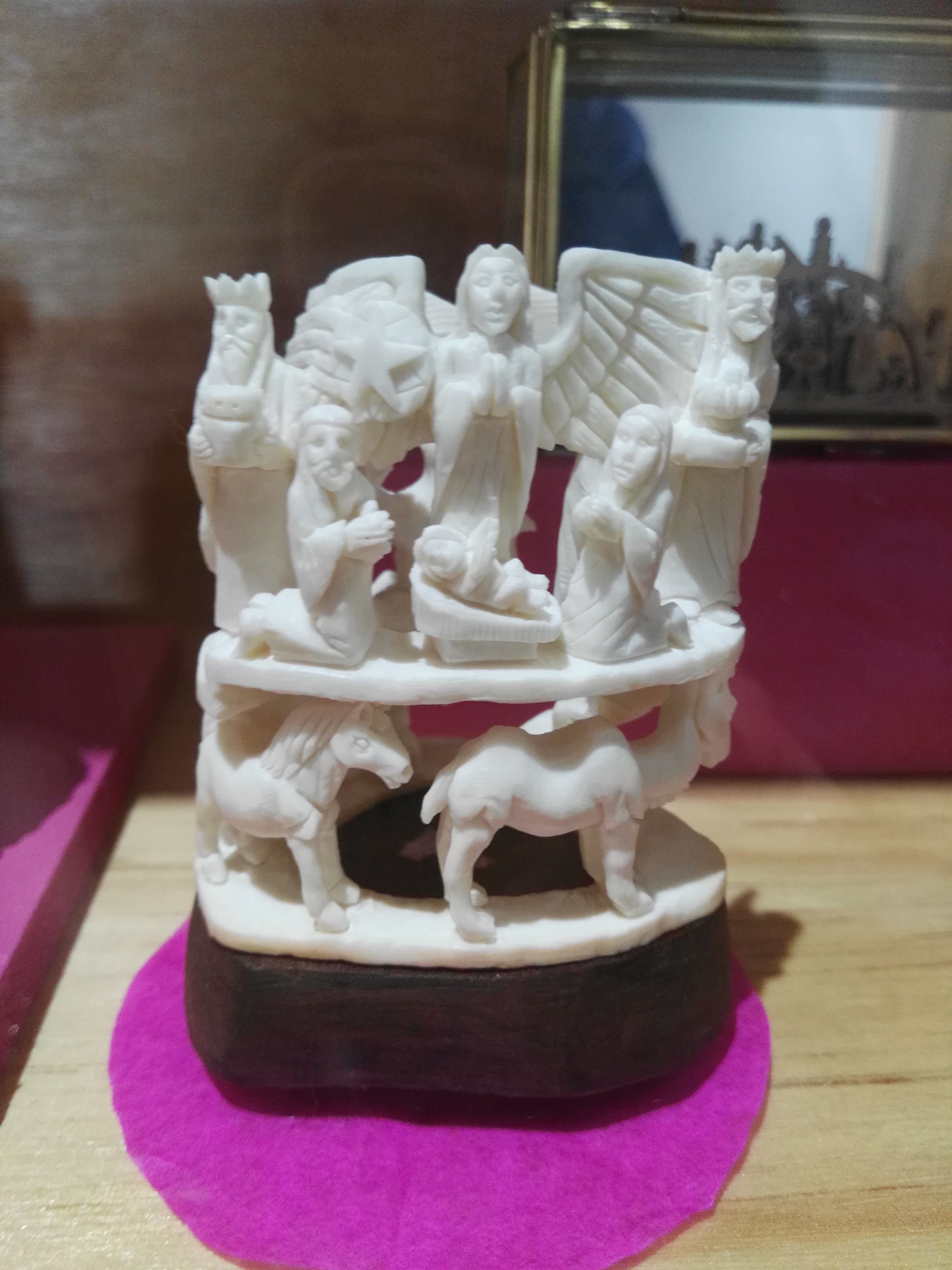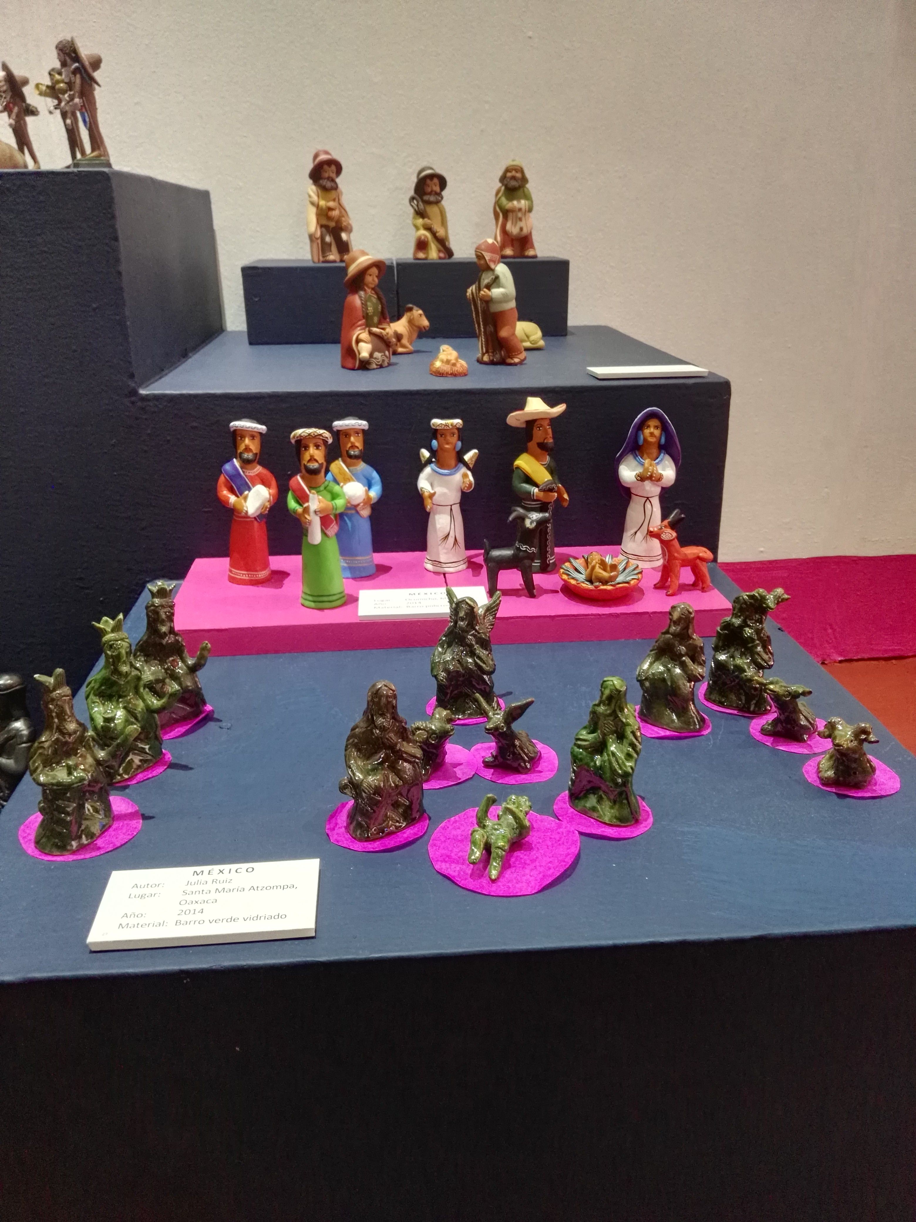 Las más de 80 piezas están elaboradas en los más inimaginables materiales como barro, piedra, cerámica, yeso, palma, hoja de maíz, cartón, hojalata, resina, bronce, vidrio, madera, porcelana, alpaca, cera, guaje, plata, plomo, cáscara de nuez, henequén, ixtle, popotillo, papel de China, fibras vegetales, mármol, ónix y hueso, entre otros.