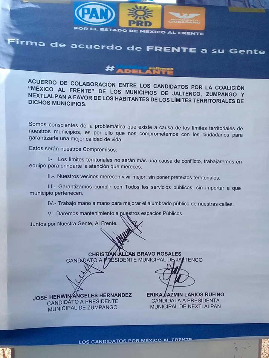 Los habitantes entre los límites territoriales de los municipios de Jaltenco, Zumpango y Nextlalpan, tendrán buenos servicios públicos, alumbrado en calles y seguridad con el compromiso firmado por los candidatos de la coalición, Por El Estado de México al Frente, con el fin de dejar de ser invisibles para las autoridades gubernamentales.