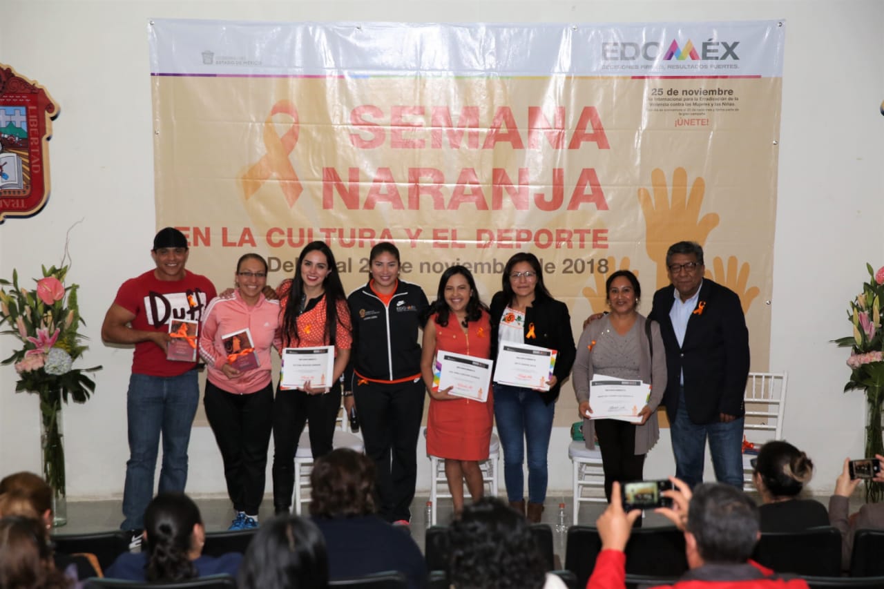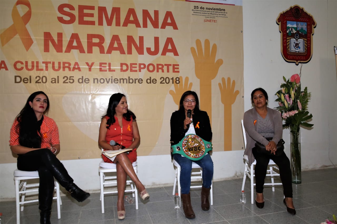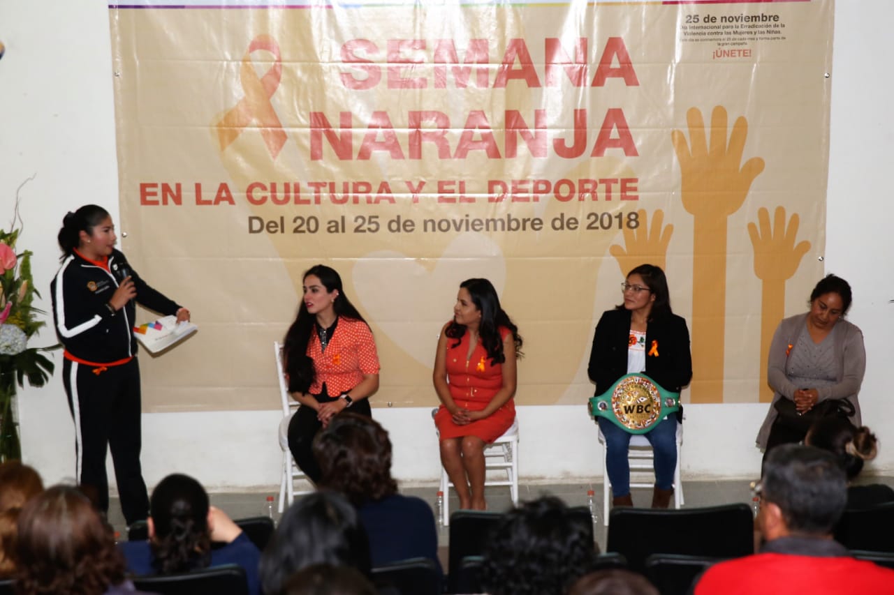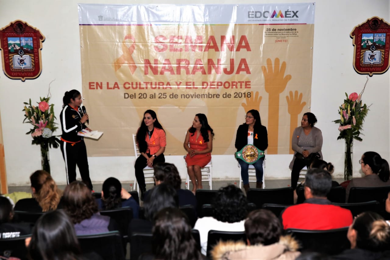 Zinacantepec, Estado de México, 25 de noviembre de 2018. Durante las actividades de la Semana Naranja, que organiza la Unidad de Género de la Secretaría de Cultura, se desarrolló la mesa de diálogo “Deportistas exitosas”, en la cual atletas con una amplia carrera compartieron las experiencias que las llevaron a obtener grandes logros en cada una de sus disciplinas.