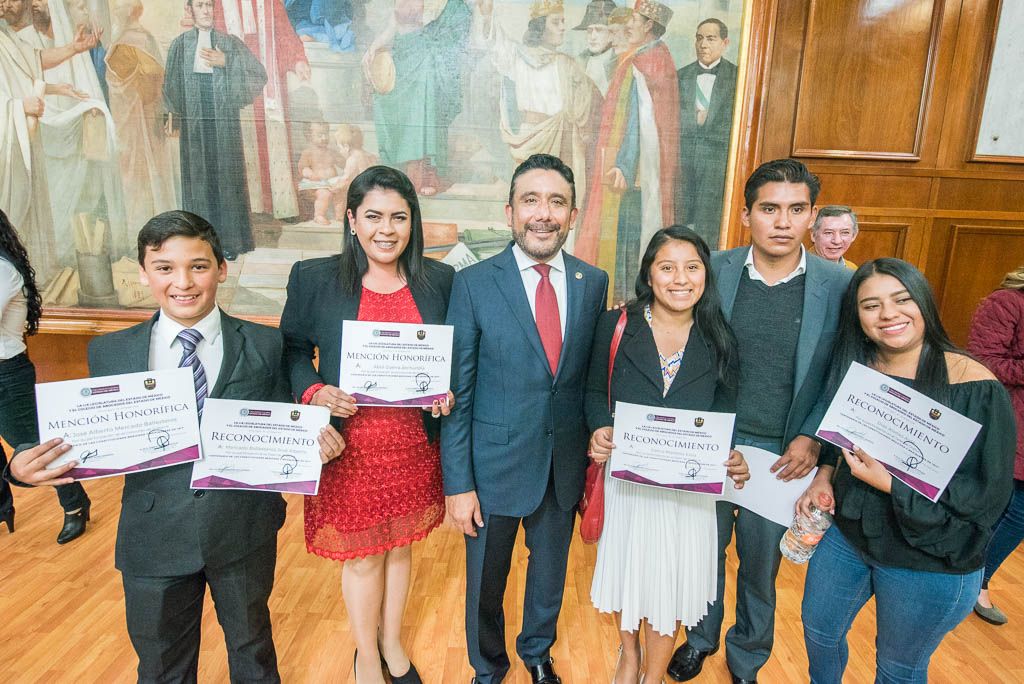El diputado Cruz Roa Sánchez, presidente de la Junta de Coordinación Política, encabezó la entrega de premios y reconocimientos a los ganadores del certamen correspondiente al taller de oratoria “Centenario de las Constituciones Mexicana y Mexiquense de 1917”, organizado por la 59 Legislatura mexiquense y el Colegio de Abogados del Estado de México.El también coordinador del Grupo Parlamentario del PRI entregó a Saúl Delgado Ayala, Alfredo Farfán Martínez y Efrén Villegas López, premios consistentes en 30 mil, 20 mil y 10 mil pesos por obtener el primero, segundo y tercer lugar en este certamen, respectivamente, en tanto, Alberto Mercado Ballesteros, de 13 años, recibió un reconocimiento especial y un apoyo económico de 10 mil pesos por su destacada participación.