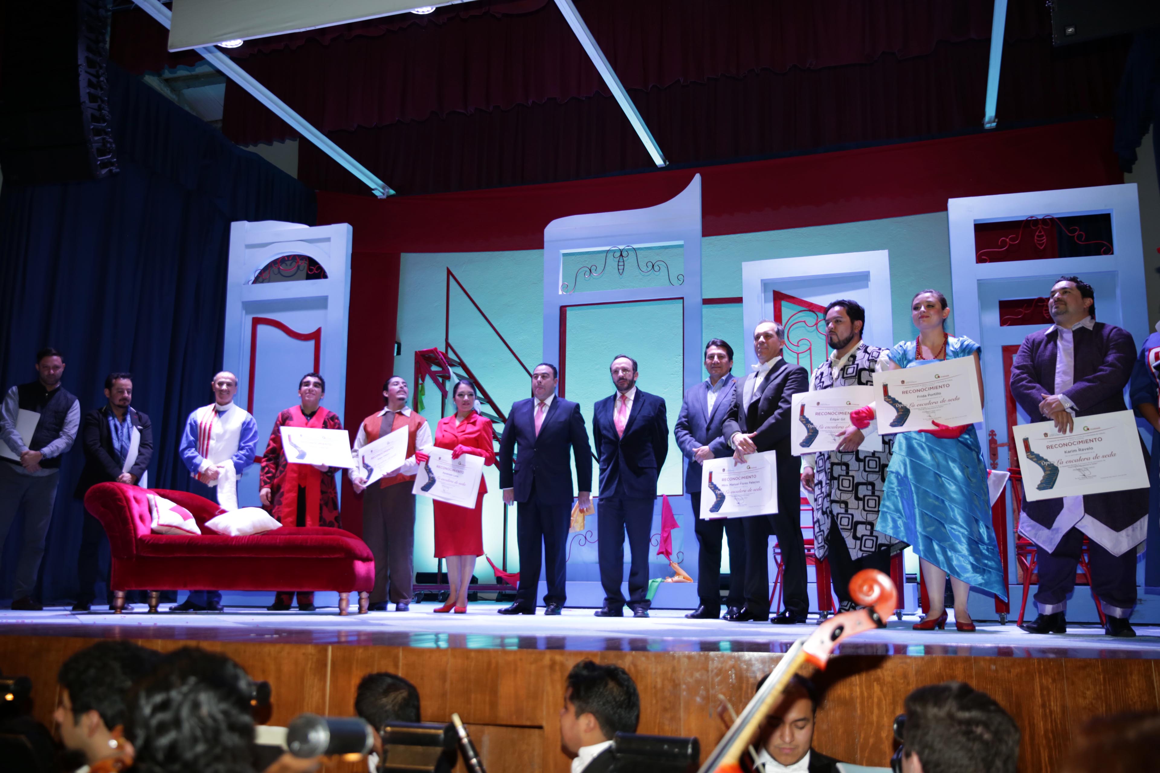 “La escalera de seda” fue compuesta por Gioachino Rossinni, con libreto de Giuseppe Maria Foppa y se estrenó por vez primera en el Teatro “San Moisè” de Venecia, Italia, en 1812. Para su puesta en escena en estos dos municipios mexiquenses contó con la participación de la soprano Penélope Luna; los barítono Édgar Gil y Alberto Albarrán; así como los tenores Karim Ravelo y Édgar Villalva, que ofrecieron una gran presentación que fue aplaudida por todos los presentes.