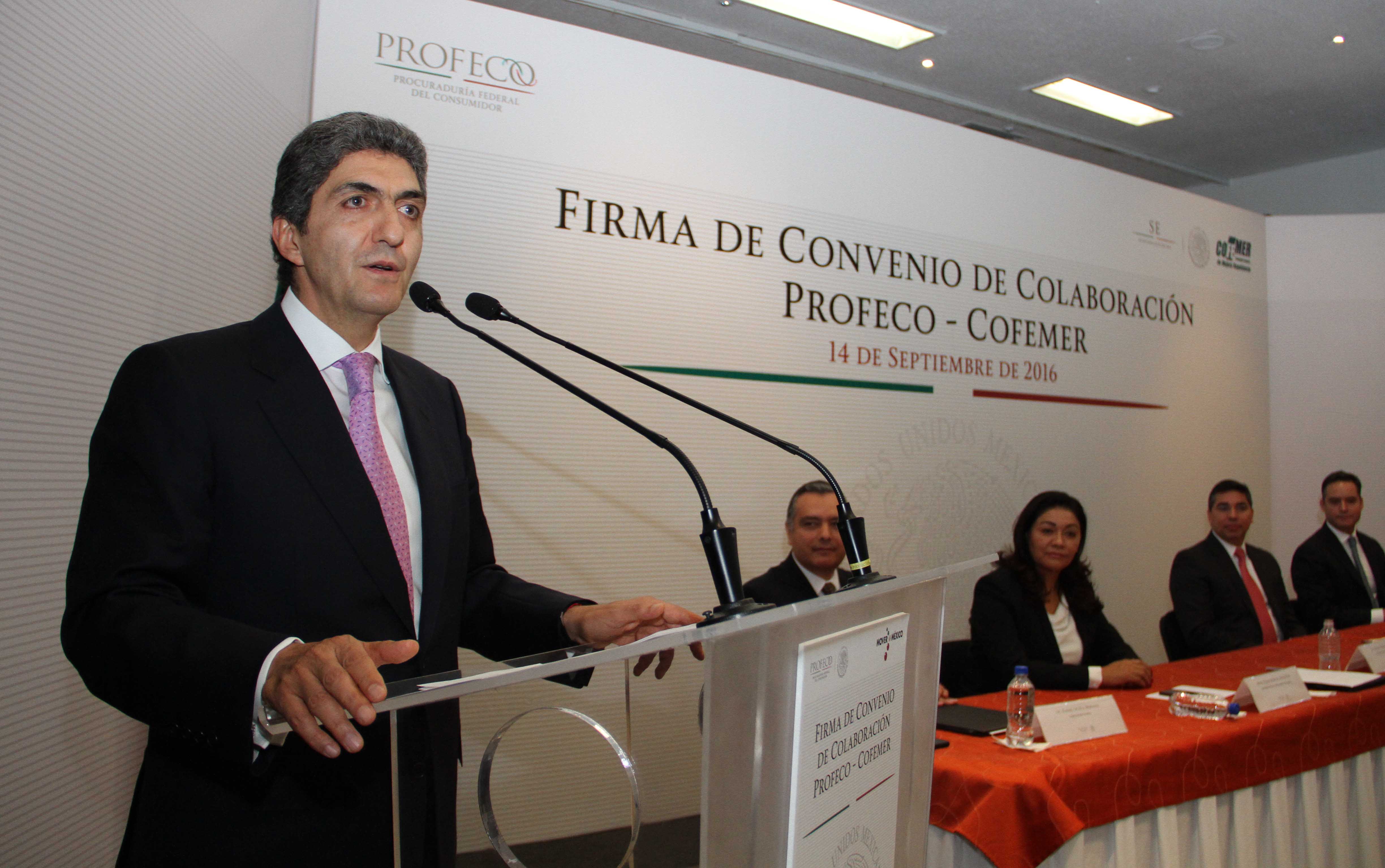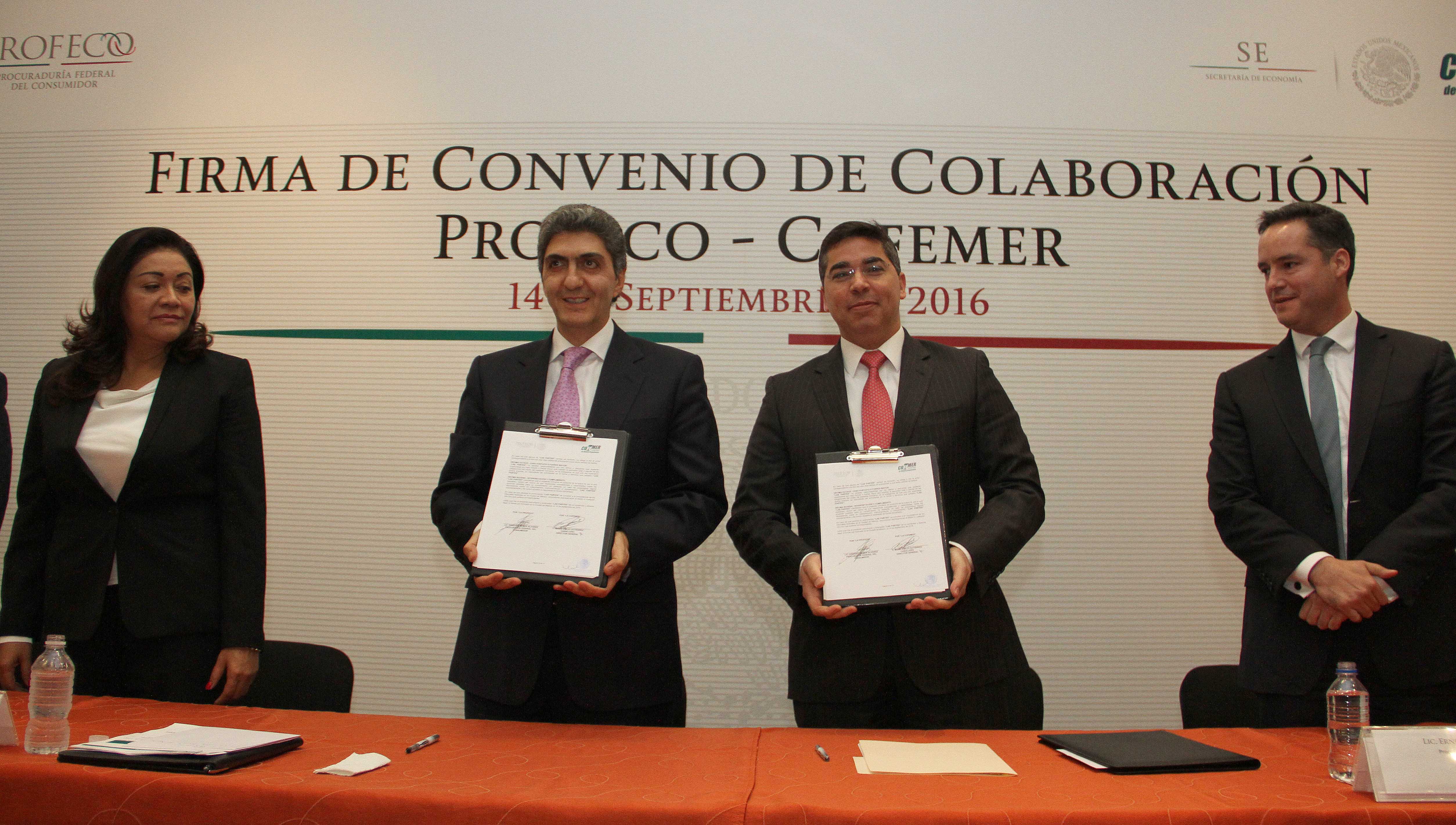 La Procuraduría Federal del Consumidor (Profeco) y la Comisión Federal de Mejora Regulatoria (Cofemer) suscribieron un convenio de colaboración para trabajar de manera coordinada y evitar la publicación de nueva normatividad que afecte a los consumidores.El Procurador, Ernesto Nemer Alvarez y el Director General de la Cofemer, Mario Emilio Gutiérrez Caballero suscribieron un convenio de colaboración para fortalecer el intercambio de información entre ambas dependencias del Sector Economía, que encabeza el secretario del ramo, Ildefonso Guajardo.