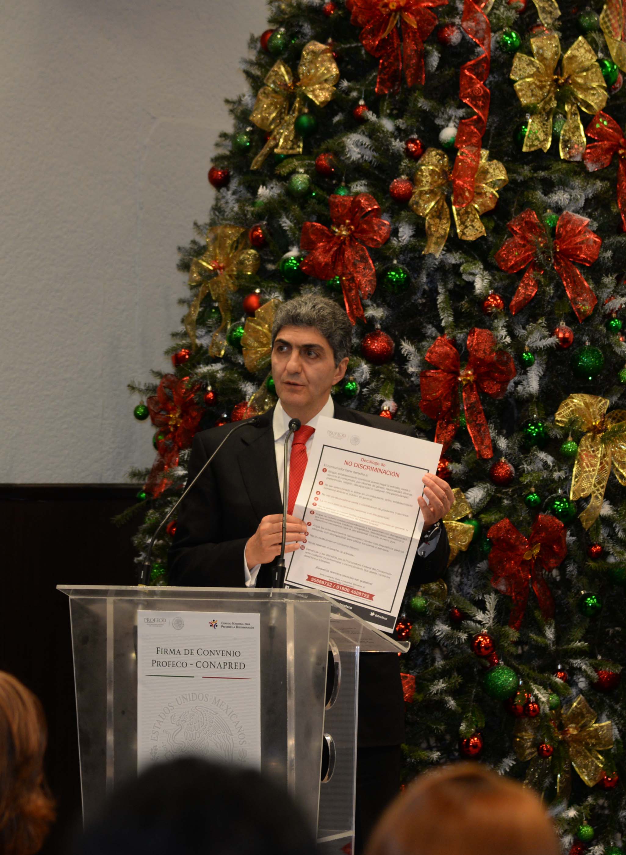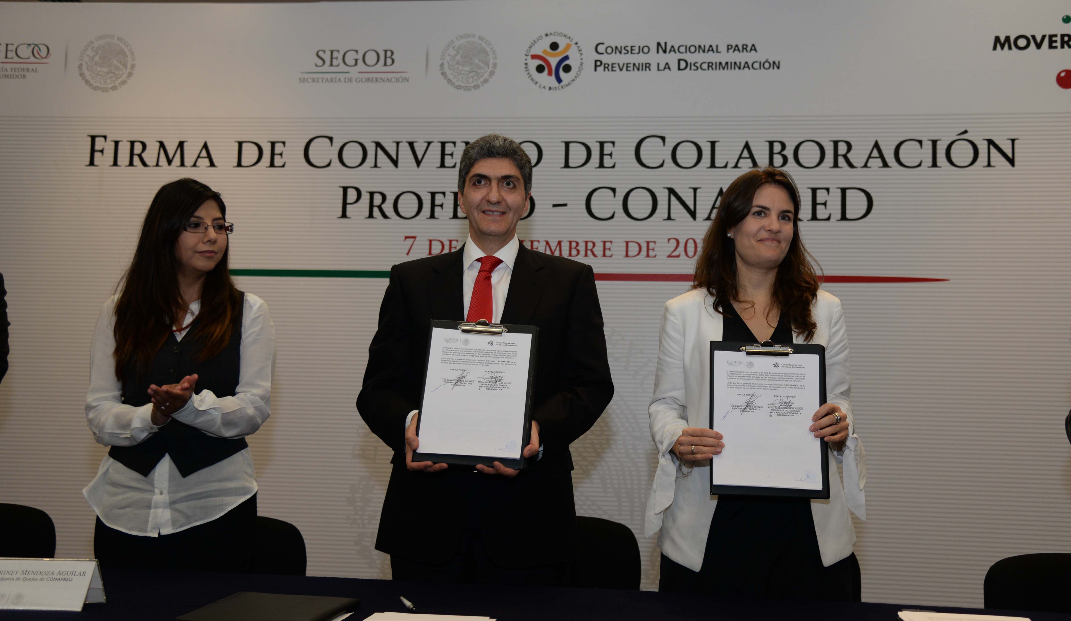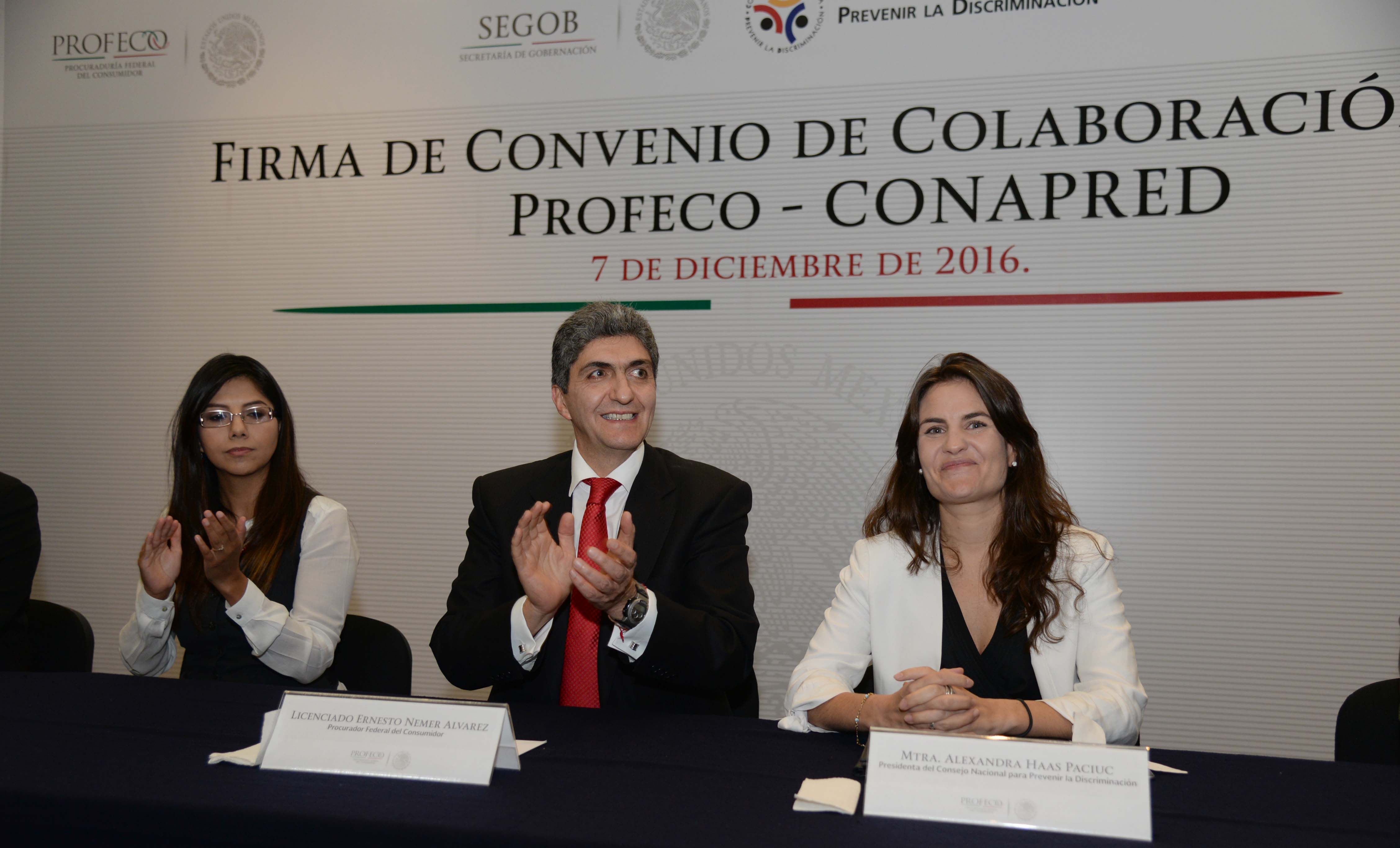 Con el objetivo de garantizar el derecho a la igualdad consagrado en nuestra Constitución, la Procuraduría Federal del Consumidor y el Consejo Nacional para Prevenir la Discriminación (Conapred) firmaron un acuerdo de colaboración para combatir cualquier tipo de discriminación en las relaciones de consumo.El convenio, formalizado por el Procurador Ernesto Nemer Alvarez y la Presidenta del Conapred, Alexandra Haas Paciuc, establece nueve acciones concretas que emprenderán ambas instancias de manera coordinada para combatir prácticas que atenten contra los derechos fundamentales de los ciudadanos.