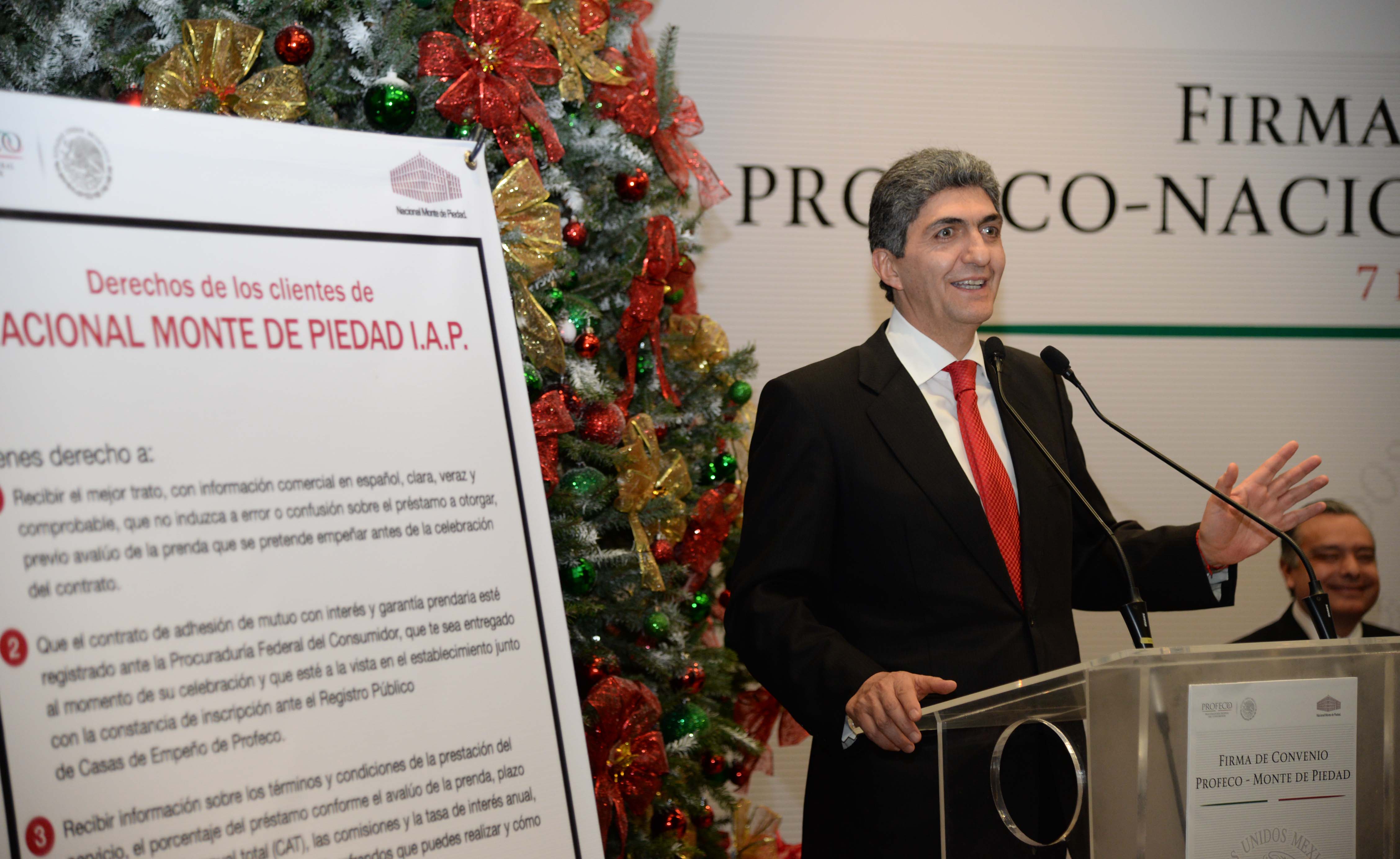 Posteriormente, el Procurador Nemer y el Director General del Nacional Monte de Piedad, Javier de la Calle, firmaron un convenio de colaboración para impulsar mejores prácticas comerciales en el sector de las casas de empeño. El acuerdo permitirá la capacitación del personal de Nacional Monte de Piedad en la protección de derechos del consumidor, así como la creación y difusión del Decálogo de Atención al Consumidor de Servicios de Mutuo con interés y Garantía Prendaría.