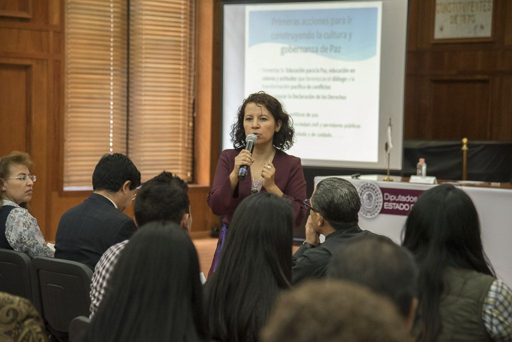 La diputada Karina Bastida Guadarrama (PRI) llamó a construir y practicar una cultura de paz, durante el taller organizado por la Contraloría del Poder Legislativo en la que los especialistas Edgar Martínez, Gloria María Abarca y Concepción Noemí Martínez señalaron que para erradicar la violencia es necesario partir de lo personal y familiar, cancelar las condiciones que la generan y superar la noción de que la violencia es propia de la naturaleza humana.Durante el Taller “Gobernanza de Paz”, el contralor del Poder Legislativo, Victorino Barrios Dávalos, dijo que una paz efectiva debe ir acompañada de justicia social y que los servidores públicos necesitan estabilidad y paz personal para trabajar al servicio de la ciudadanía, al tiempo que se pronunció por la apertura y la tolerancia.