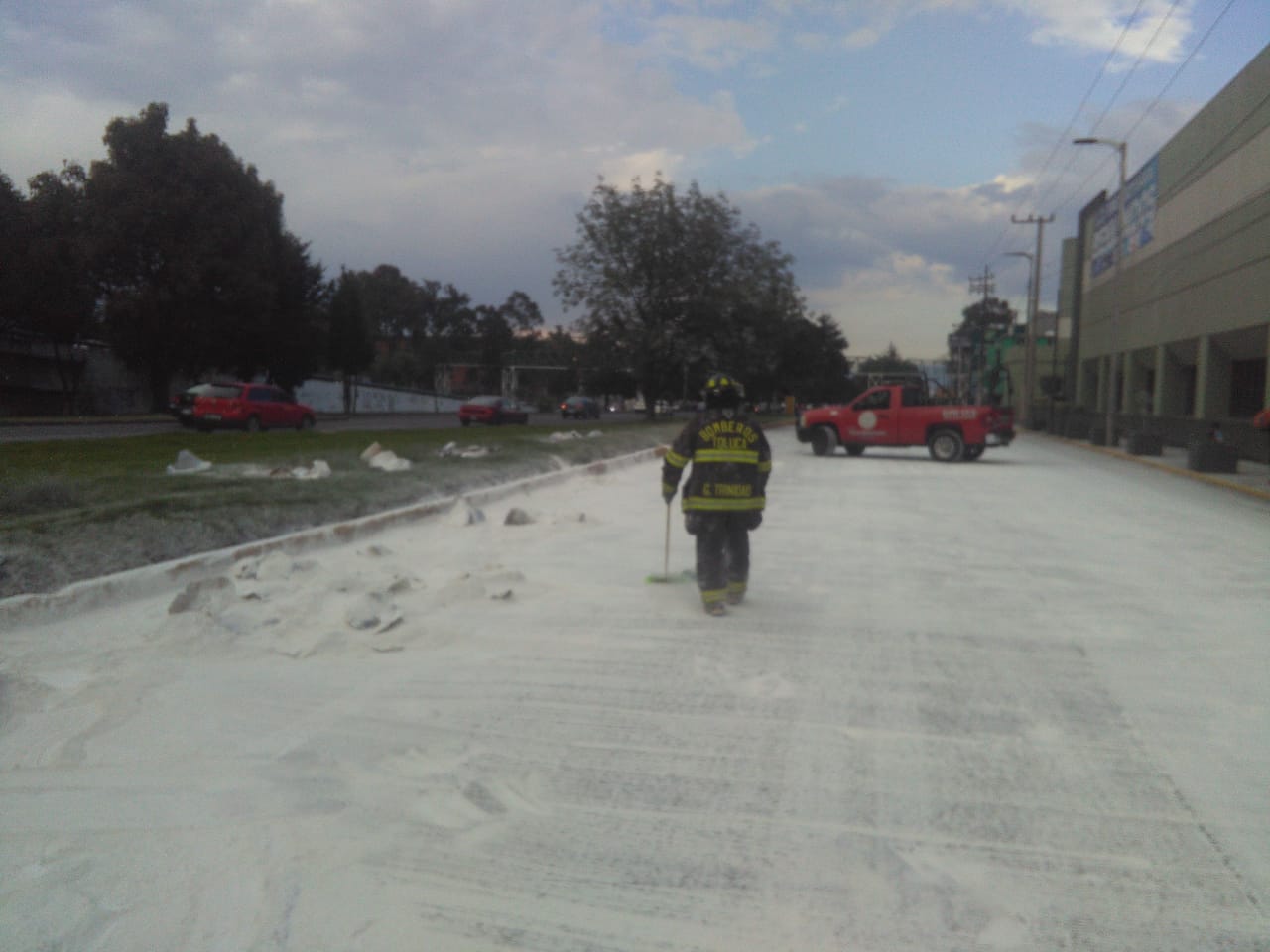 Toluca, Estado de México.-Bomberos de Toluca realizaron trabajos de limpieza en la avenida Paseo Tollocan a la altura de la delegación de Santa Ana Tlapaltitlán, luego de que un camión de carga derramara material de construcción, incidente en el que no se reportaron afectaciones mayores.