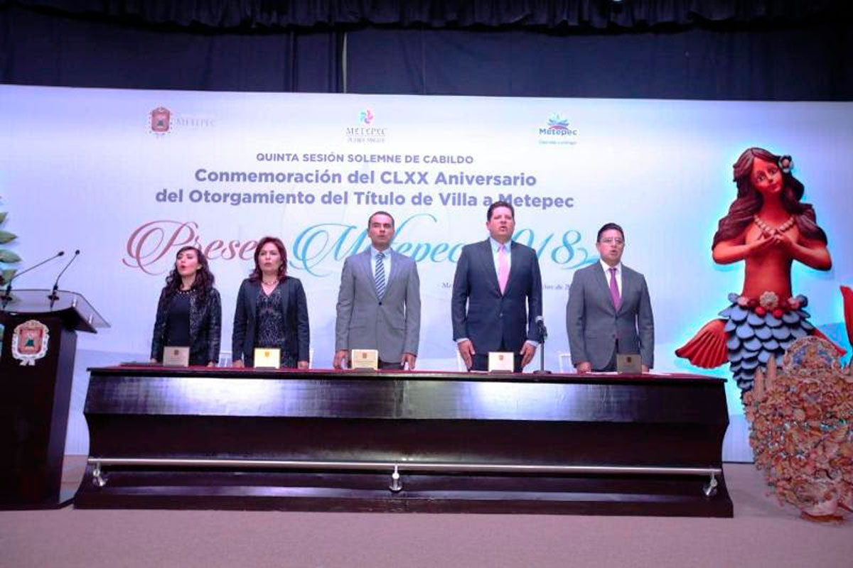 Metepec, México.- En el marco de la quinta sesión solemne de Cabildo y la conmemoración del 170 aniversario del otorgamiento del título de villa al pueblo de Metepec, el cuerpo edilicio reconoció a 15 ciudadanos ejemplares con la Presea Metepec 2018.
