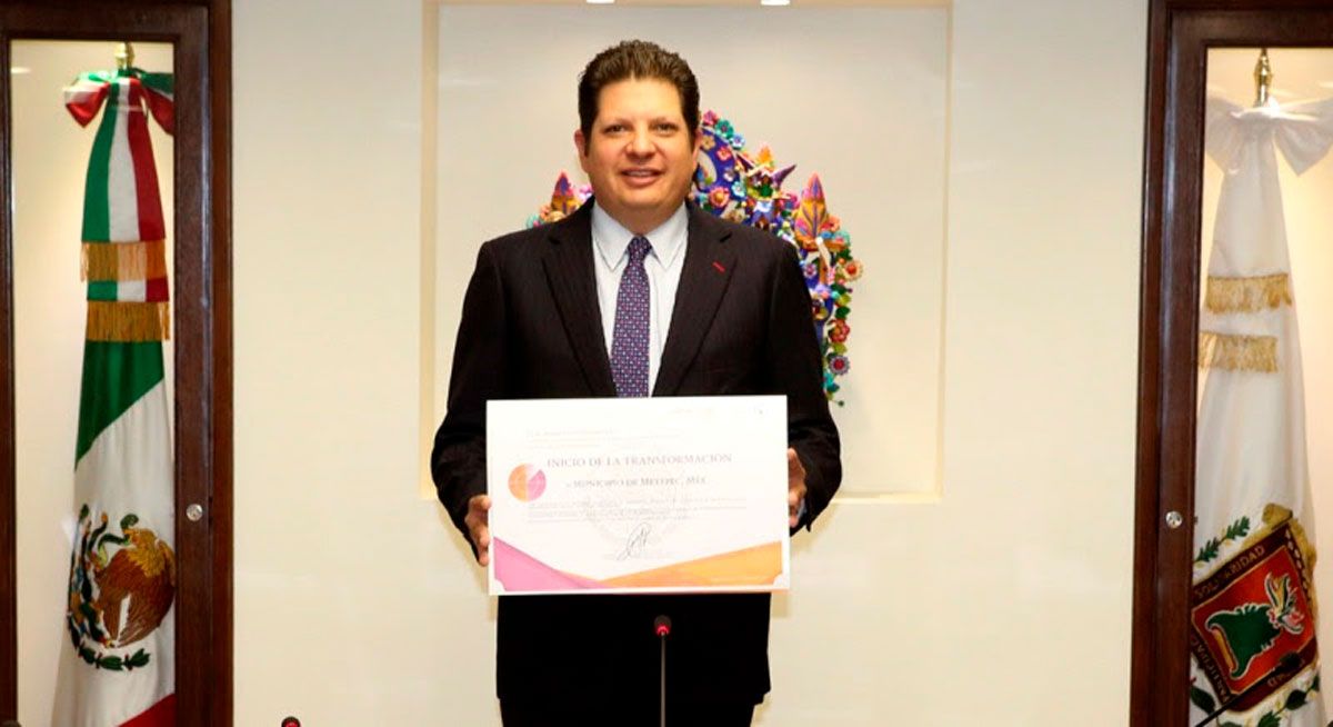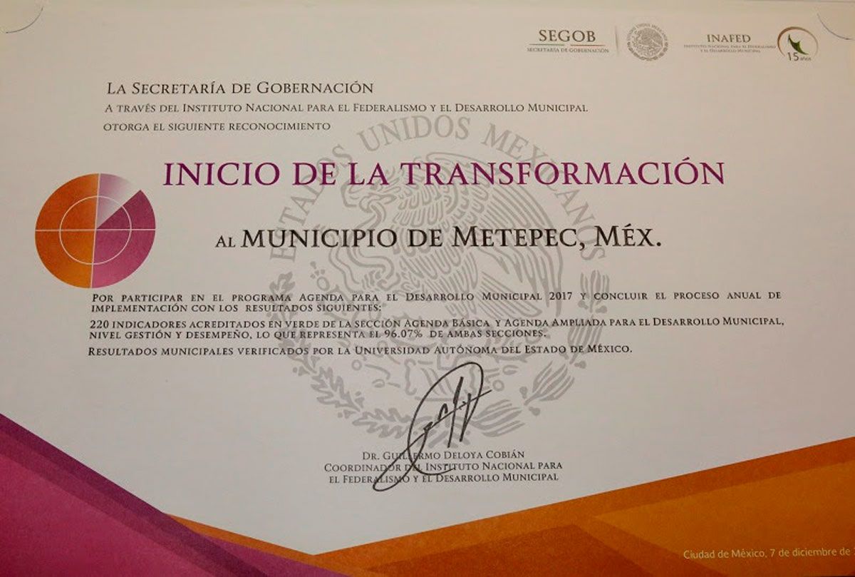 Metepec, México.- Por cumplir con el 96.07 por ciento de los indicadores para el desarrollo municipal planteados en 2017, la Secretaría de Gobernación, a través del Instituto Nacional para el Federalismo y el Desarrollo Municipal (INAFED), entregó el reconocimiento “Inicio de la Transformación” al ayuntamiento de Metepec, encabezado por el alcalde David López Cárdenas.