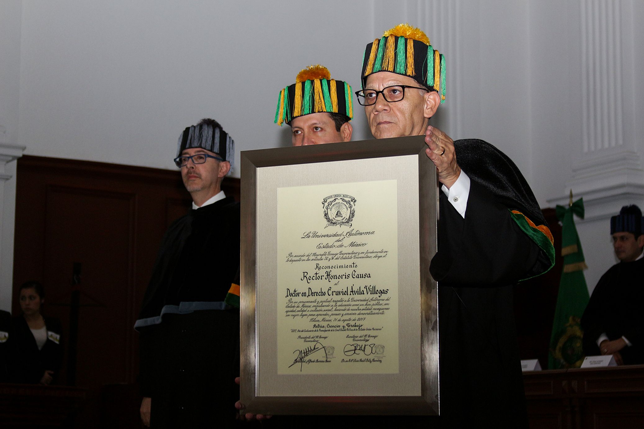 “Mi compromiso y lealtad hacia la Universidad Autónoma del Estado de México serán para toda la vida”, aseguró el gobernador mexiquense, Eruviel Ávila Villegas, durante la ceremonia en la cual el rector Alfredo Barrera Baca lo invistió con el Rectorado Honoris Causa de la Máxima Casa de Estudios mexiquense y destacó que el mandatario estatal “constituye un ejemplo de congruencia entre pensamiento, palabra y obra para toda persona con vocación de servicio público”. “Honraré todos los días este reconocimiento que se me ha otorgado”, sostuvo Ávila Villegas, en el Aula Maga “Lic. Adolfo López Mateos” del Edificio de Rectoría, donde también manifestó que “lo que hicimos como equipo y lo que hice como gobernador fue corresponder a la confianza y generosidad que la Universidad me confirió”.