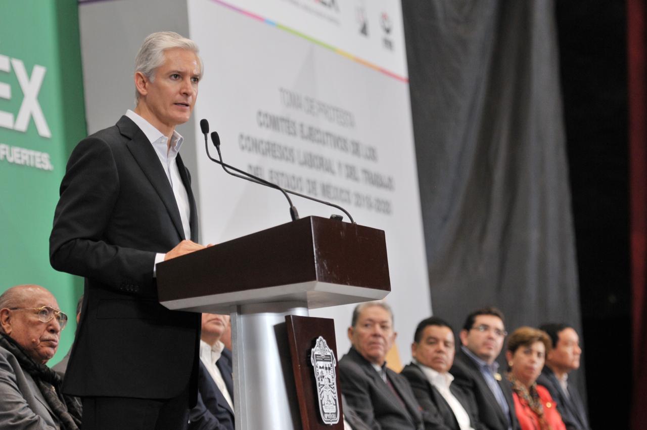 Alfredo Del Mazo indicó que la entidad cuenta con instituciones sindicales sólidas que garantizan la defensa de los derechos laborales de los trabajadores mexiquenses, e hizo un llamado para seguir sumando esfuerzos y estrechando los lazos de cooperación con el gremio laboral, para enfrentar el complejo entorno económico internacional que se vive actualmente.