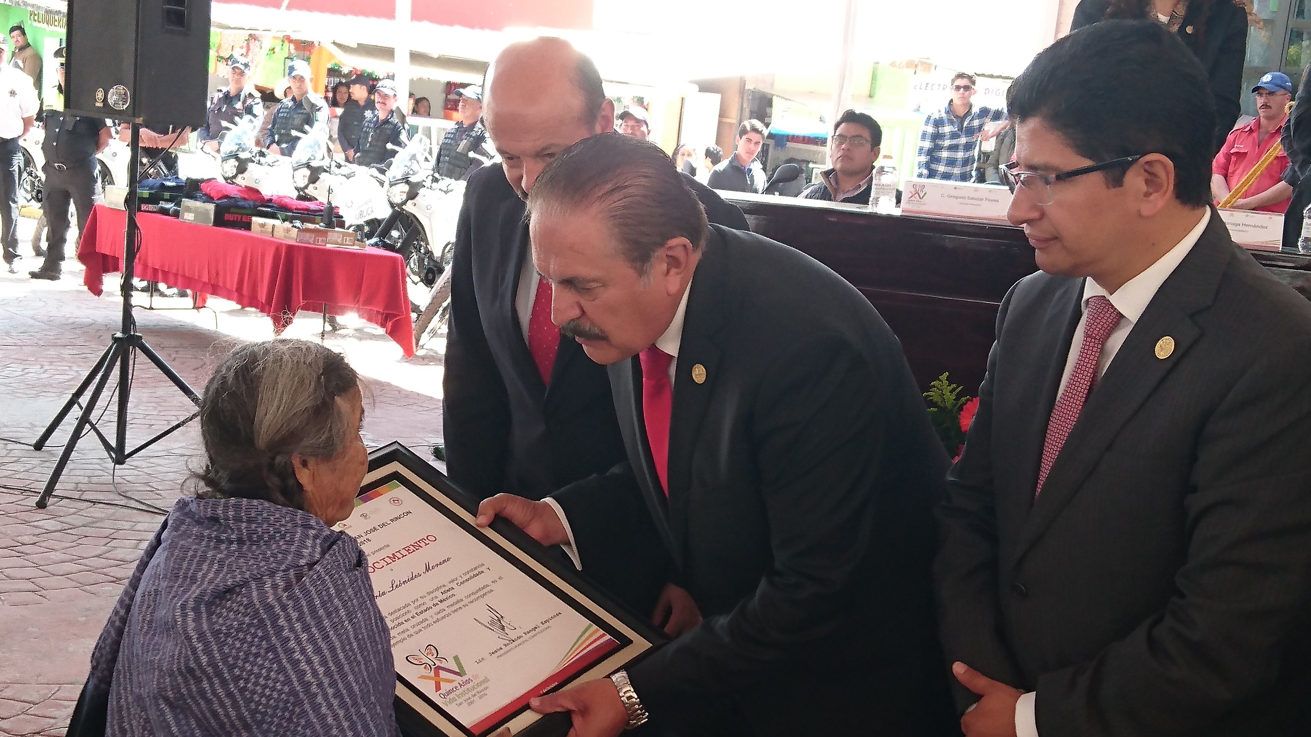 Durante el evento se entregaron reconocimientos a ciudadanos destacados del municipio y se hizo entrega de equipamiento al personal de Protección Civil y Seguridad Pública, entre ellos uniformes, radiocomunicadores, motocicletas y más.