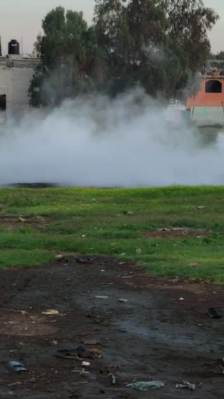 Elementos de Protección Civil de Tecámac, y Ecatepec, con chorros de agua controlan la salida del gas, evitando que la nube que se forma avance hacia la zona habitacional.