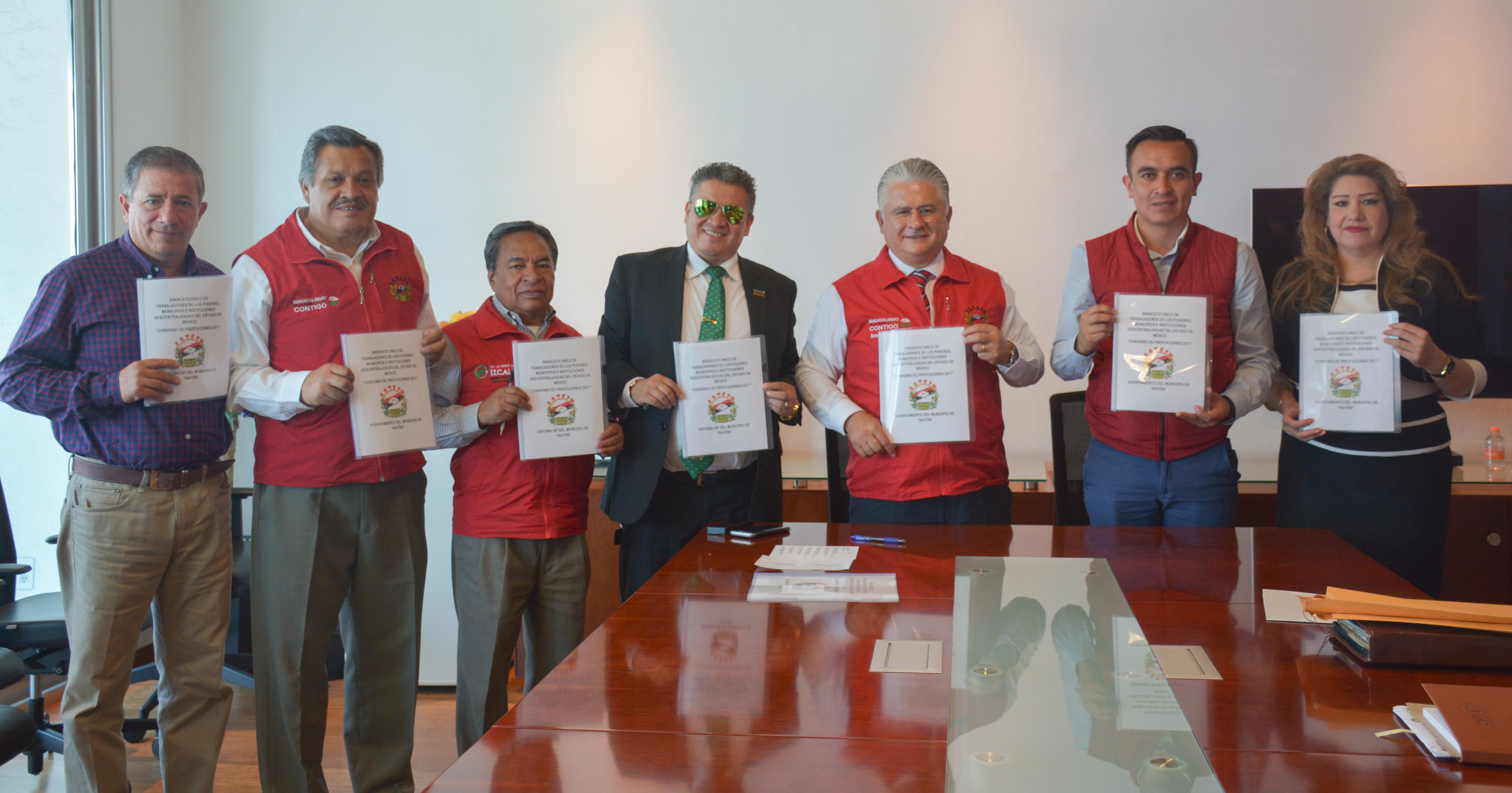 Como una forma de fortalecer y asegurar la estabilidad laboral de los trabajadores sindicalizados del municipio de Rayón; el Sindicato Único de Trabajadores de los Poderes, Municipios e Instituciones Descentralizadas del Estado de México (SUTEYM), y esta demarcación signaron el Convenio de Sueldo y Prestaciones Socioeconómicas 2017 con un incremento del 5% directo al salario de los trabajadores. El Lic. Herminio Cahue Calderón, Secretario General del SUTEYM, agradeció la voluntad y disposición del Alcalde José Luis Robles Vázquez al seguir considerando como parte de su equipo de trabajo a los servidores públicos sindicalizados. Dijo que la concreción de este acuerdo se da cuando hay voluntad, y la relación institucional es franca, honesta, limpia y transparente.