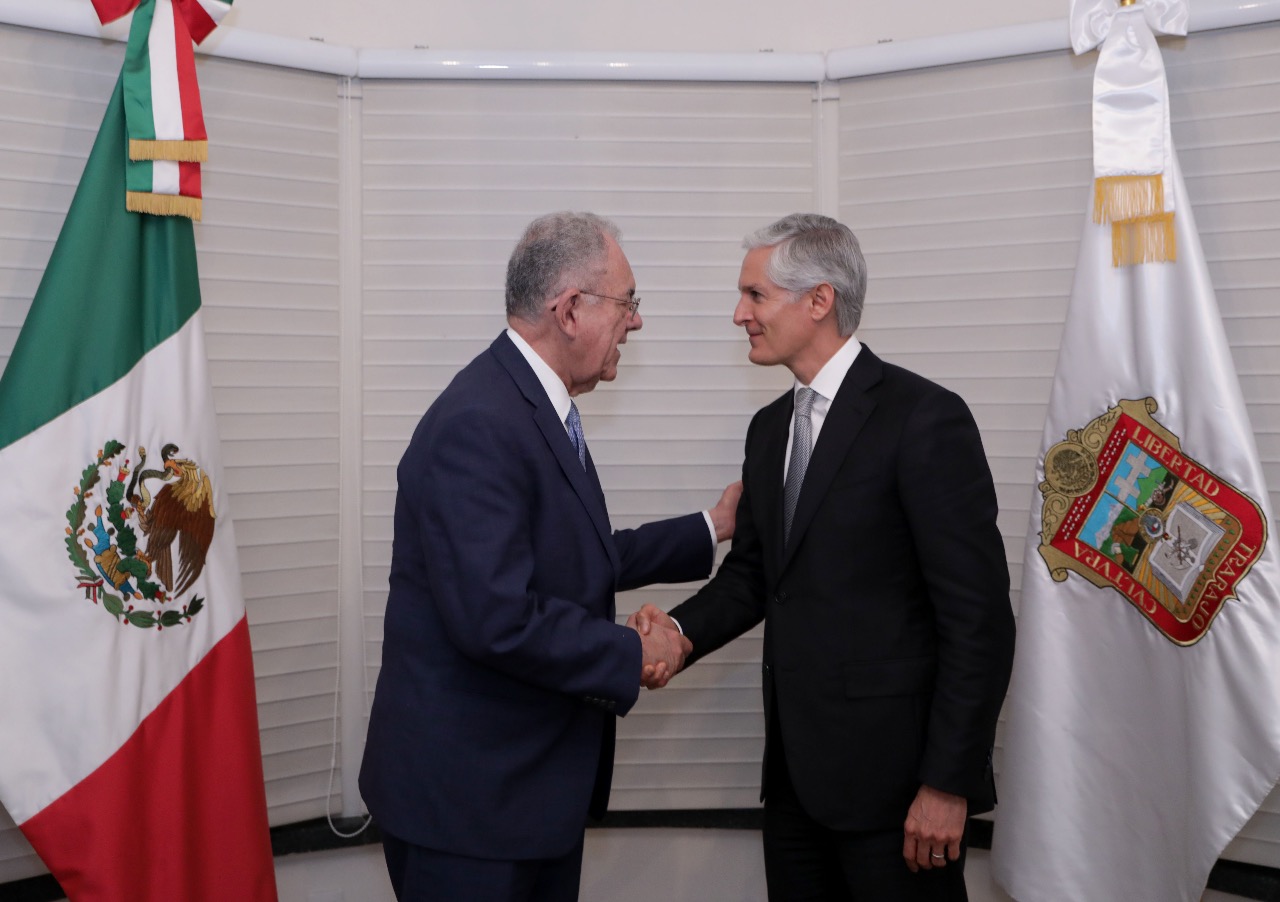 Ciudad de México, 7 de noviembre de 2018. El Gobernador Alfredo Del Mazo Maza sostuvo una reunión con el próximo titular de la Secretaría de Comunicaciones y Transportes (SCT), Javier Jiménez Espriú, en donde hablaron del desarrollo y fortalecimiento del Aeropuerto Internacional de Toluca (AIT).