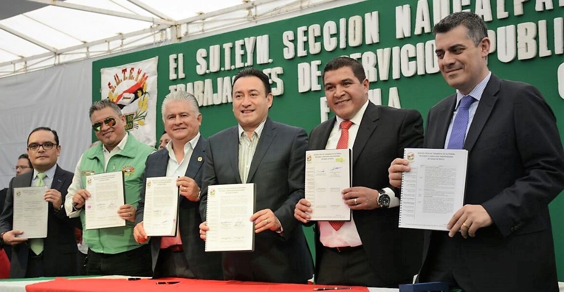 En el marco de la celebración del “Día del Servidor Público”, el Sindicato Único de Trabajadores de los Poderes, Municipios e Instituciones Descentralizadas del Estado de México (SUTEYM) firmó el Convenio de Sueldo y Prestaciones Socioeconómicas 2017 con el Ayuntamiento y Organismo de Agua de Naucalpan. El Lic. Herminio Cahue Calderón, Secretario General del SUTEYM, y el Presidente Municipal Constitucional de Naucalpan, Edgar Armando Olvera Higuera, encabezaron la signa del documento que establece un incremento salarial del 7 por ciento para los más de cuatro mil trabajadores sindicalizados de la administración.