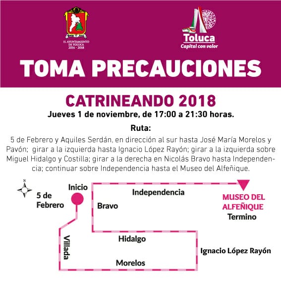 Serán 16 contingentes los que participarán entre ellos Catrineando, grupo cultural que inició con dicho desfile hace ocho años; Escuela de Bellas Artes; Universidad Autónoma del Estado de México; Servidores Públicos del H. Ayuntamiento de Toluca que deseen participar; entre otros que se sumarán al recorrido que en punto de las 19:00 horas partirá de la Plaza González Arratia, en la esquina de las calles 5 de Febrero y Aquiles Serdán en dirección sur hasta la avenida José María Morelos, girará a la izquierda en Juan Aldama, circulará por Miguel Hidalgo hasta Nicolás Bravo, donde girará al norte para continuar por la avenida Independencia hasta el Museo del Alfeñique.