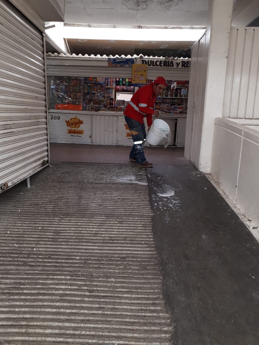 Toluca, Estado de México.- El lavado de pasillos, accesos principales, puertas, muros y áreas comunes, constituye parte de los trabajos de mantenimiento que el gobierno municipal de Toluca realiza de manera constante en los mercados Benito Juárez, 16 de Septiembre, Morelos e Hidalgo, con el objetivo de mejorar la imagen y promover la actividad comercial en el municipio.