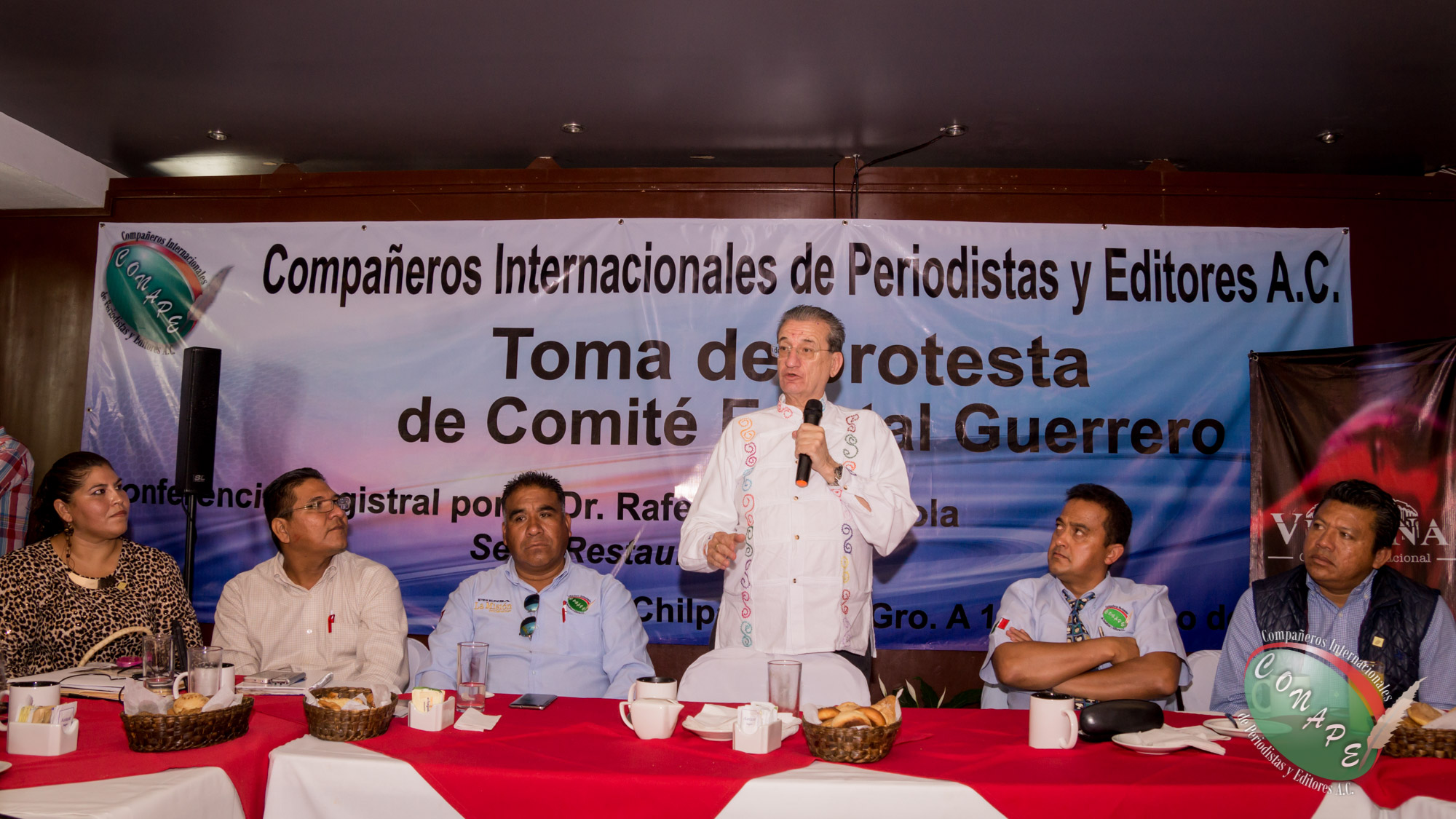Chilpancingo, Guerrero.- El pasado 11 de Agosto del 2018, se llevó acabo la toma de protesta de la estructura que estará trabajando en la Vicepresidencia de Compañeros Internacionales de Periodistas y Editores A.C. (CONAPE) en el estado de Guerrero. En el evento estuvieron presentes poco más de 70 periodistas, dueños de medios de comunicación, líderes sociales, editores y comunicadores de la entidad, quienes rindieron protesta a los estatutos y reglamentos que rigen la organización, precedida por el Presidente Internacional L.C.C. Raúl González Nova; el Vicepresidente Internacional, Lic. Alfredo Hernández Alvarado; el Mtro. en Periodismo Christian González Murillo quien ocupa el cargo de Vicepresidente de Imagen Institucional Radio y TV CONAPE; y el reconocido escritor y periodista Rafael Loret de Mola Vadillo, Asesor Internacional de CONAPE.
