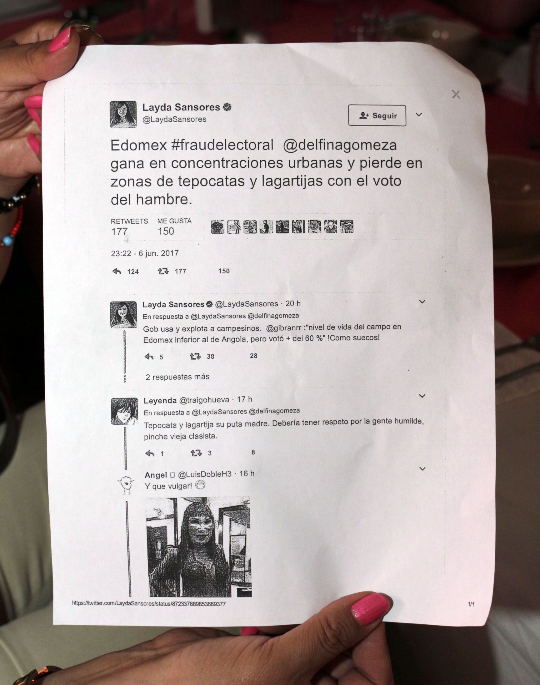 “Nosotros votamos por quien nos convenció, en este caso fue el PRI, no podemos aceptar que se piense que se coacciono o compro nuestro voto, ni tampoco que la senadora considere que somos no pensantes o capaces de decidir nuestro futuro”.Aseguraron los pueblos indígenas del estado de México, al exigir una disculpa pública a la Senadora, Layda Sansores, luego de que el pasado miércoles en su cuenta de twitter publicara que Delfina Gómez perdió en las zonas de Tepolcatas y Lagartijas con el voto de hambre, obviamente en el estado de México, situación que ofendió terriblemente a los pueblos originarios por lo que solicitaron además intervención de la comisión de Derechos Humanos para que tome cartas en el asunto.