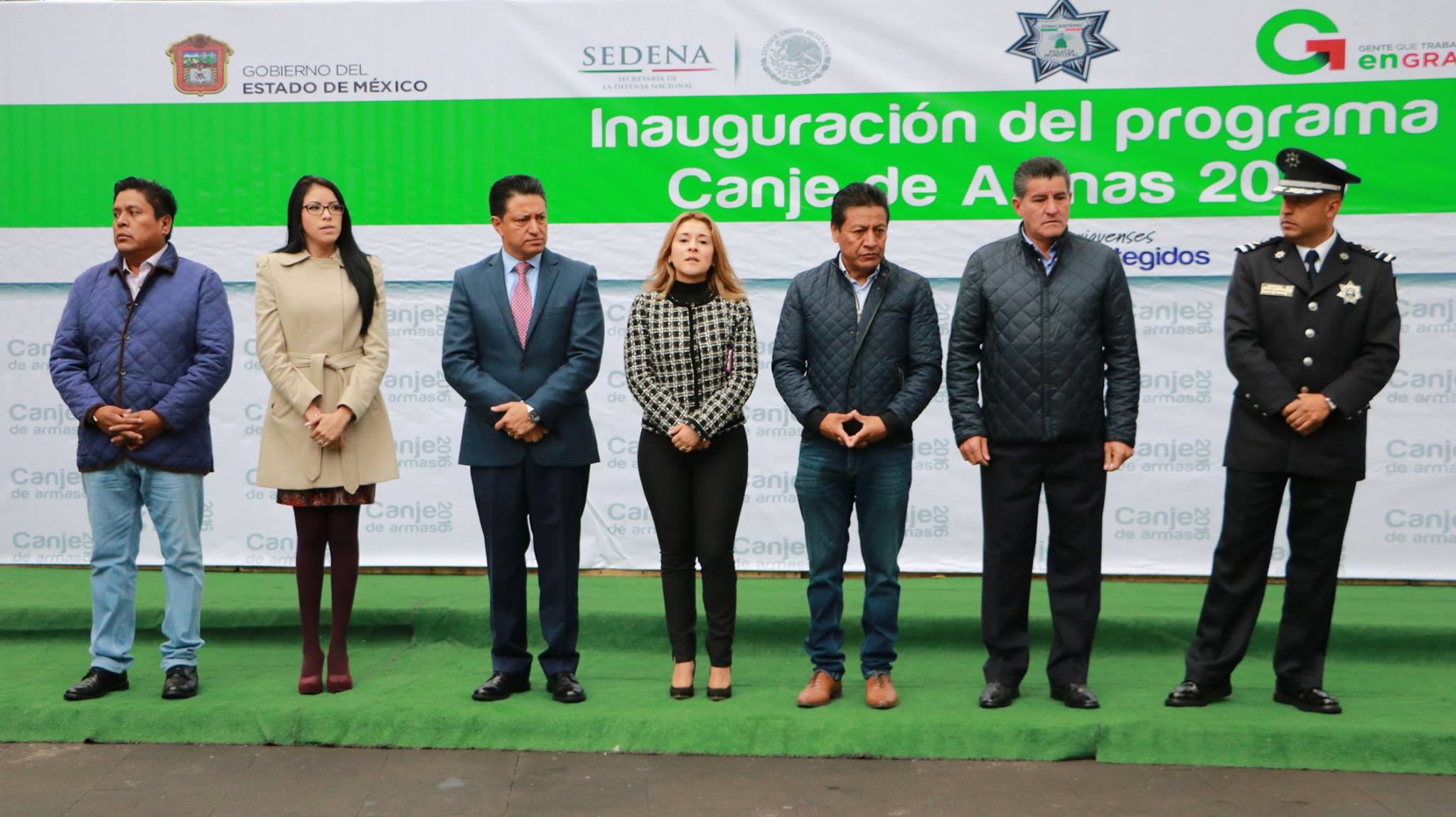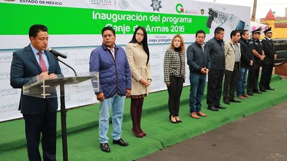 El presidente municipal de Zinacantepec, Manuel Castrejón Morales, en compañía de Eduardo Valiente Hernández, comisionado Estatal de Seguridad Ciudadana, inauguraron el programa “Canje de armas 2016” con el objetivo de recolectar para su destrucción de forma voluntaria, anónima, pacífica y acordada armas de fuego e instrumentos bélicos en poder de la ciudadanía, a cambio de recibir un aparato electrónico o monto económico a fin de evitar actos violentos coadyuvando con la seguridad de todos los mexiquenses.En este sentido, Castrejón Morales, señaló que este programa que en coordinación con la Secretaria de Defensa Nacional (SEDENA), el gobierno estatal y municipal, estará hasta el 29 de octubre, en la plaza cívica “Iniciamos un programa, una de las tantas acciones que el gobernador Eruviel Ávila Villegas ha emprendido a favor de la seguridad de la sociedad” refirió.